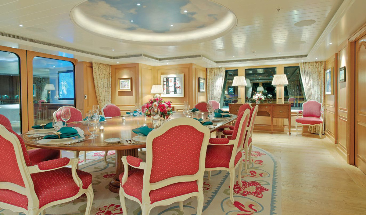 The upper deck aft contains the alfresco dining area which is designed to seat 12 guests in stately elegance with drinks available from the nearby bar. Along the stern, there is a surplus of seating arranged so that guests can break off into smaller groups for more personal conversations.