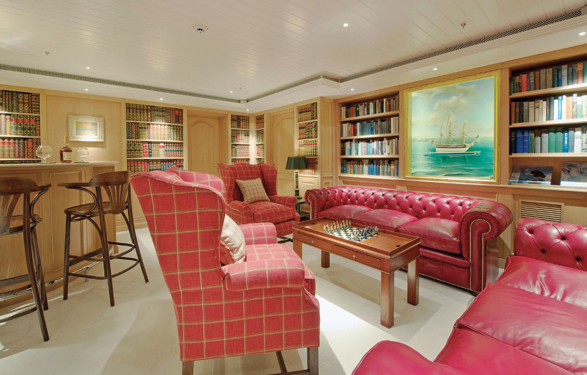 In the middle, there are two almost symmetrical seating areas on the port and starboard sides and there is a grand piano for live entertainment.
