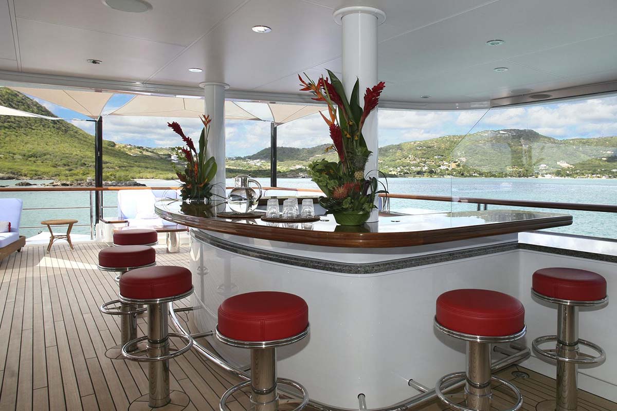 The upper deck aft contains the alfresco dining area which is designed to seat 12 guests in stately elegance with drinks available from the nearby bar. Along the stern, there is a surplus of seating arranged so that guests can break off into smaller groups for more personal conversations.