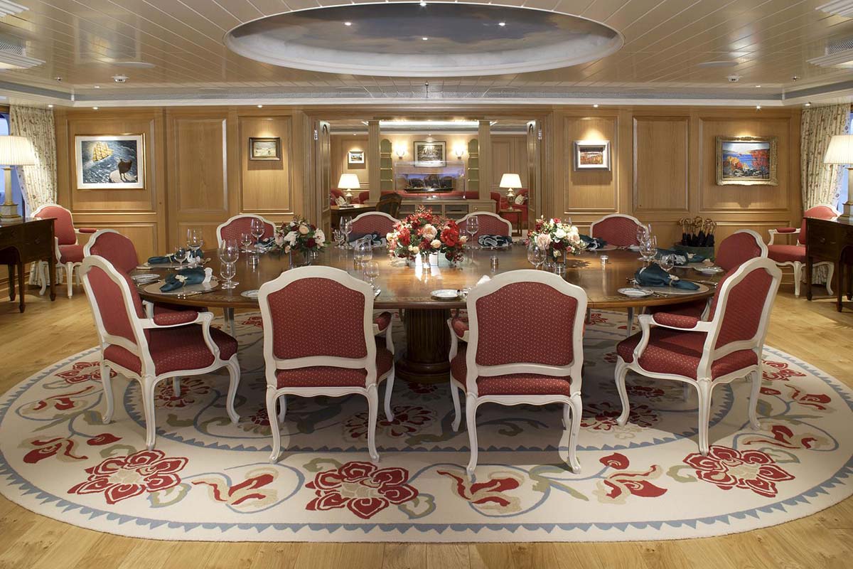 The upper deck aft contains the alfresco dining area which is designed to seat 12 guests in stately elegance with drinks available from the nearby bar. Along the stern, there is a surplus of seating arranged so that guests can break off into smaller groups for more personal conversations.