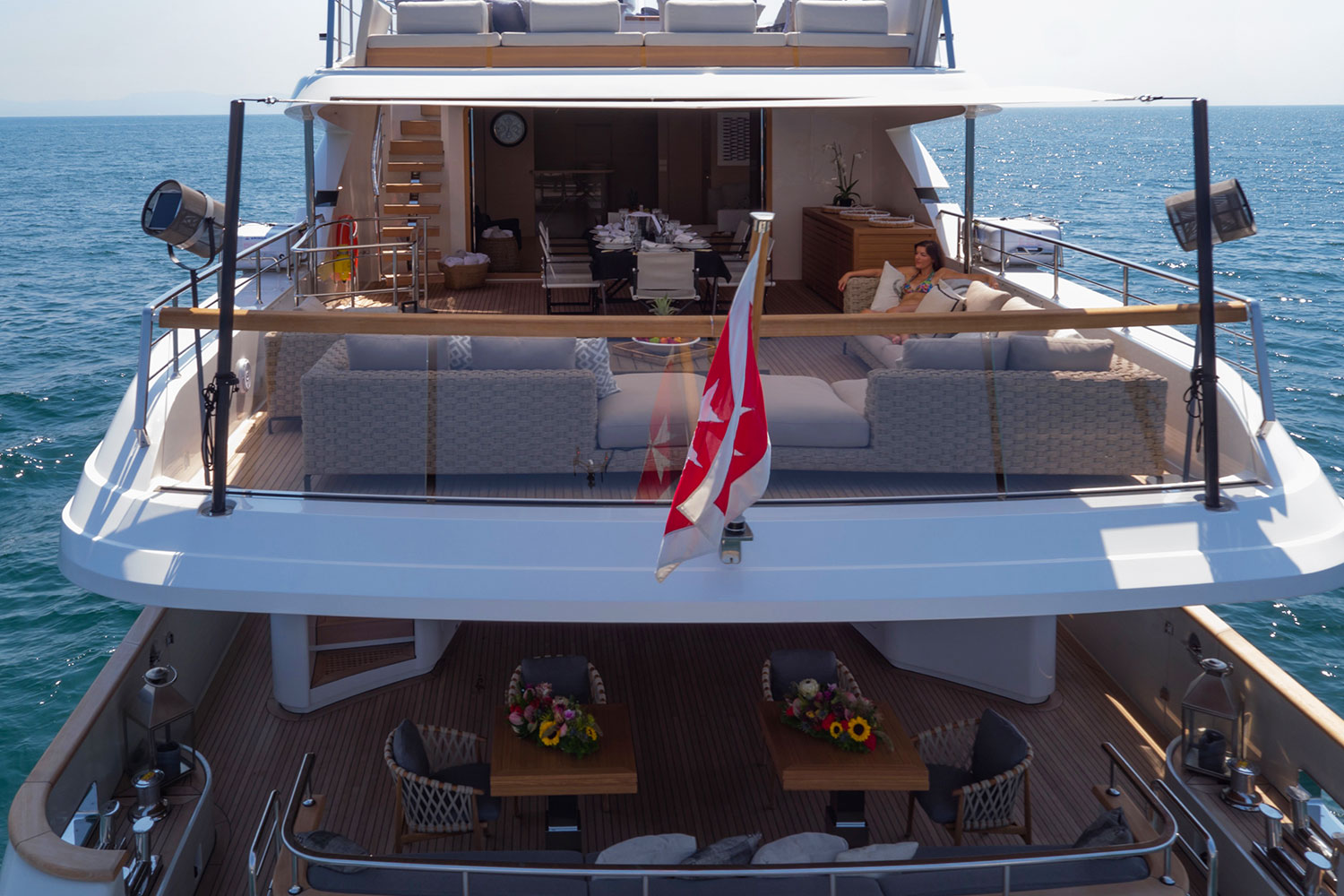 The generous main aft deck can be used as a comfortable seating area or converted into an al fresco dining space for 11 guests. Further dining is available in the upper salon which is also a relaxing lounge area.