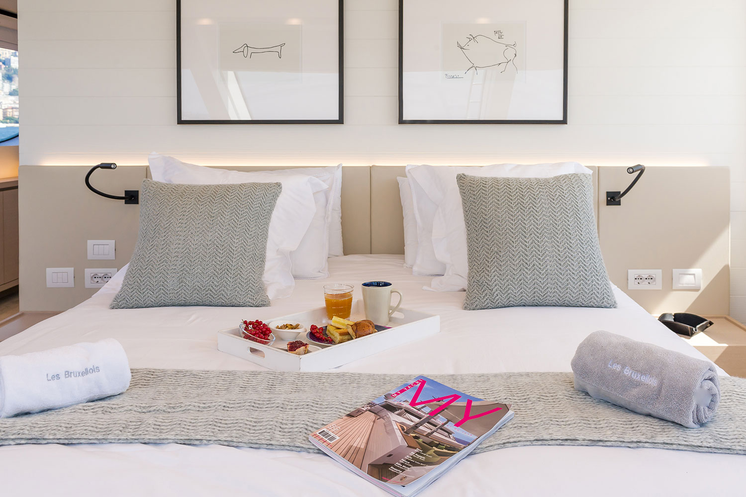 Highly inviting and superbly versatile, her interior configuration allows 11 charter guests to sleep in 5 luxurious cabins There are a main deck owner’s suite and 4 lower deck cabins, 2 doubles and 2 twins. These include 2 convertibles and one with an extra Pullman berth. All have air-con with Wi-Fi connection.