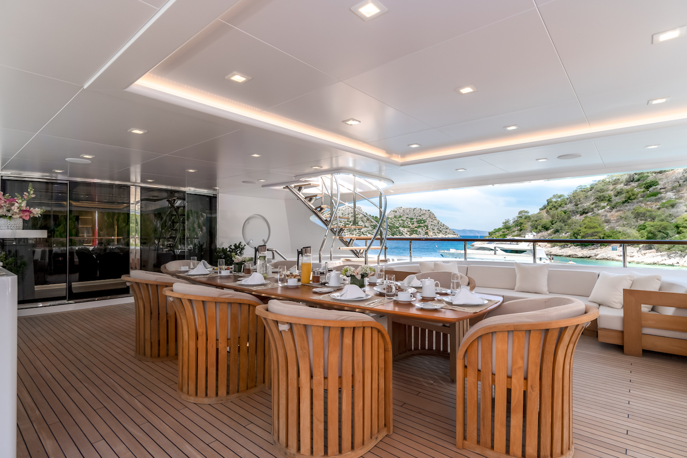Once upstairs, there is an outdoor lounge fitted into the stern with additional seats surrounding a large table that can be used for hobbies or for alfresco dining. Side decks wrap around to the main foyer, while the area on the ...