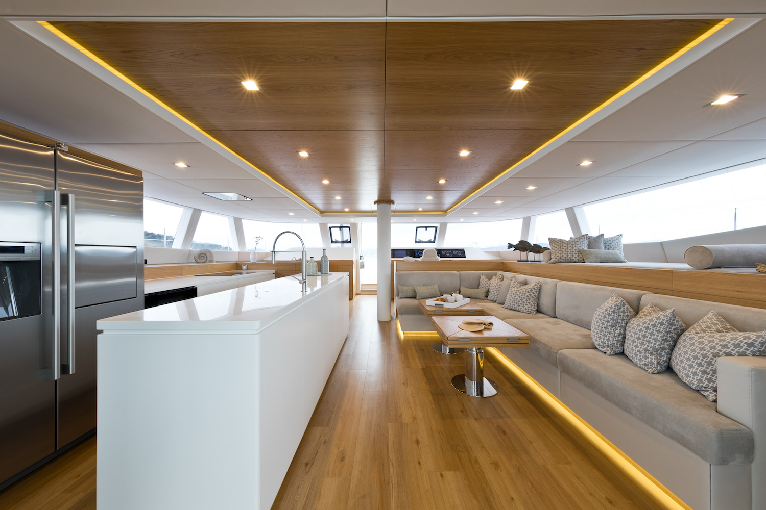Two coffee tables fold out to become a large dining area as required, which is serviced by the galley located opposite.