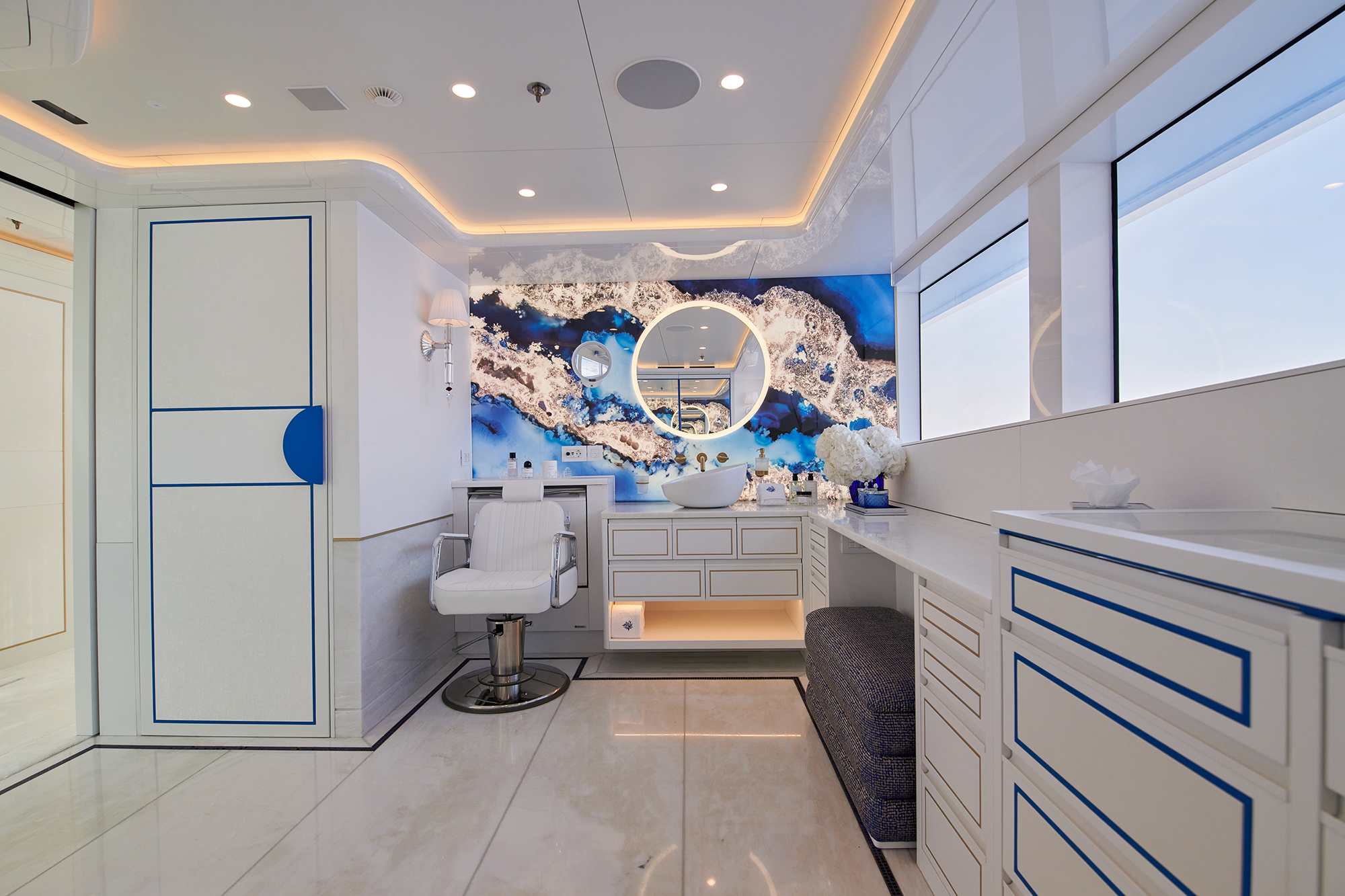 The formal dining area is located in the centre of the main deck with a separate main salon capable of hosting two separate seating areas behind.