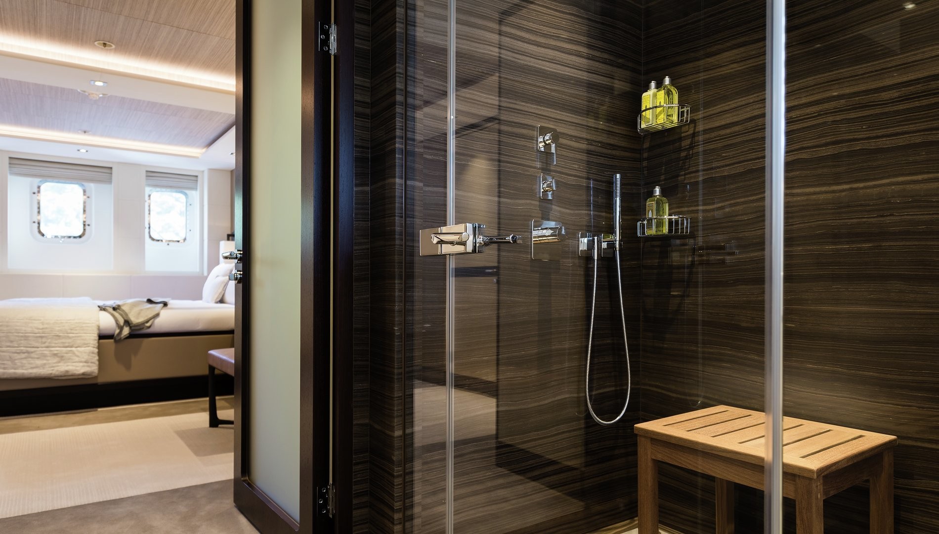 There is a large main deck aft with integrated outdoor seating for morning coffee, while the swim platform ensures guests have close contact with the water and easy access to the water toys.