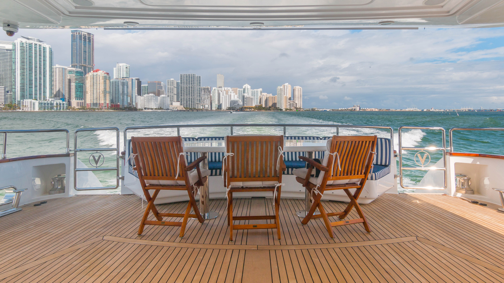Entering the main salon from the aft deck, guests are greeted by a social wet bar, cocktail table, and generous lounge. Further forward is a formal dining area seating 8. The lower deck accommodation is spacious in 1 master, 1 VIP and 2 twin cabins.