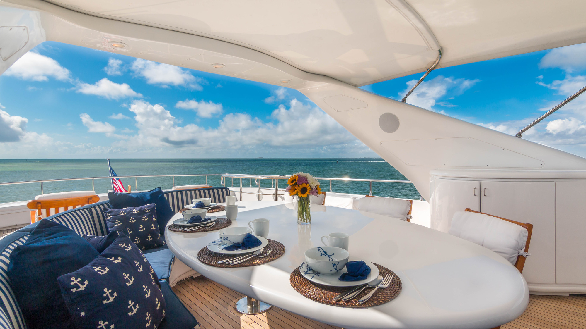Entering the main salon from the aft deck, guests are greeted by a social wet bar, cocktail table, and generous lounge. Further forward is a formal dining area seating 8. The lower deck accommodation is spacious in 1 master, 1 VIP and 2 twin cabins.