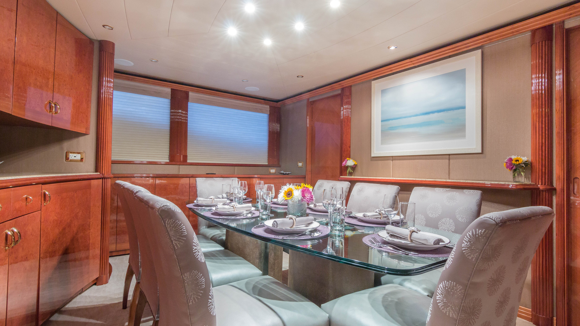 Further forward is a formal dining area seating 8. The lower deck accommodation is spacious in 1 master, 1 VIP and 2 twin cabins.