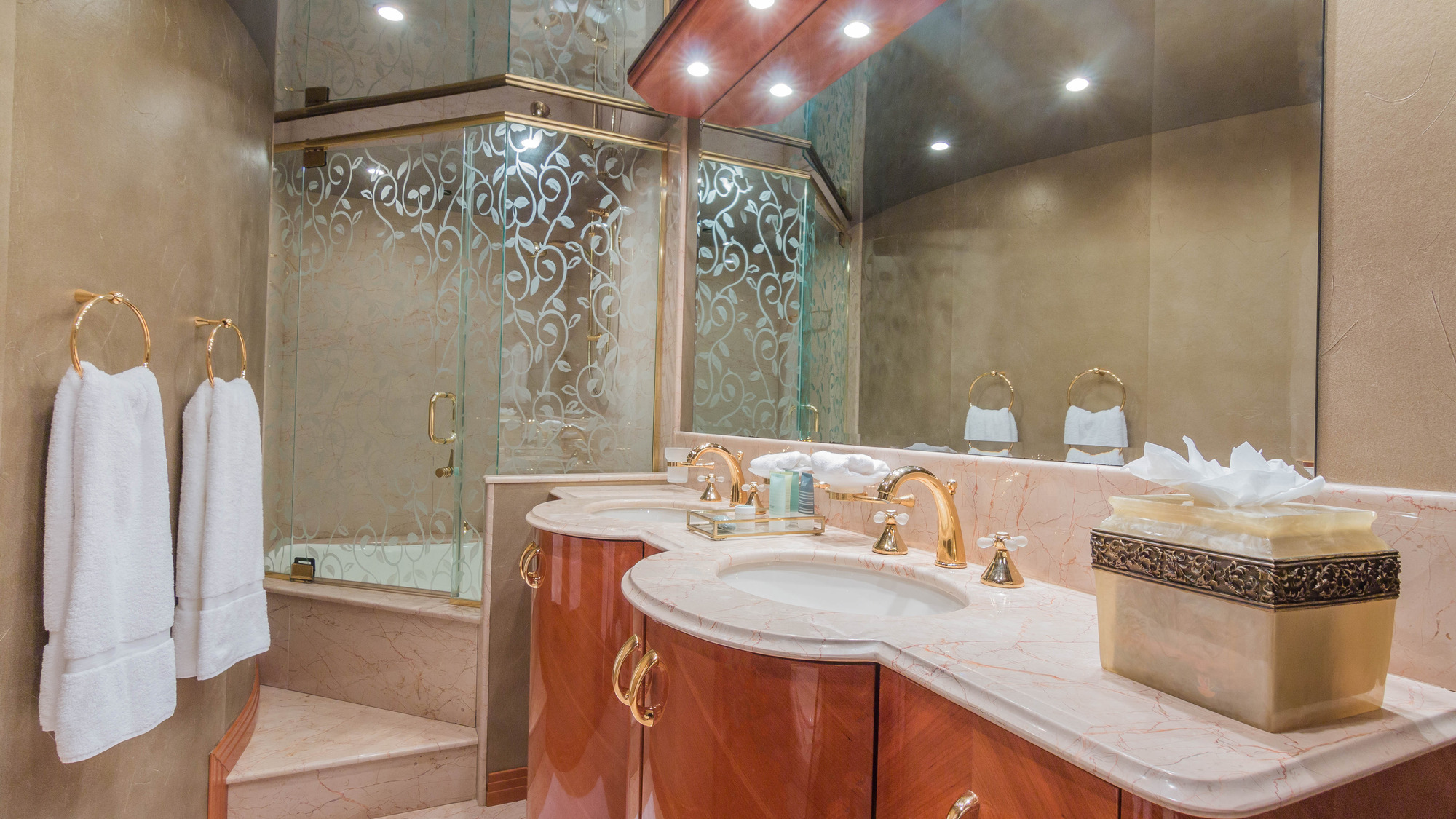 The Viking Sports Cruiser’s outdoor living is ideally suited for luxury charter, offering plenty of areas to relax and entertain. An aft deck is shaded with alfresco dining and seating, a great spot to also watch the water toys in action, from the extended swim platform. Sun lovers will appreciate a quiet escape to the large bow sunpad.