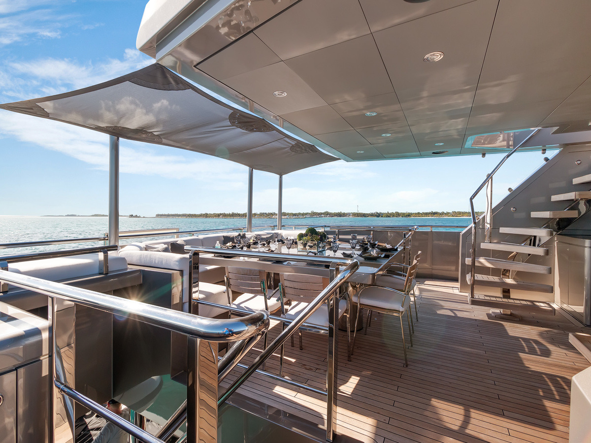 Alfresco dining options are available on the decks, either in the shaded areas or up on the sundeck next to the Jacuzzi.