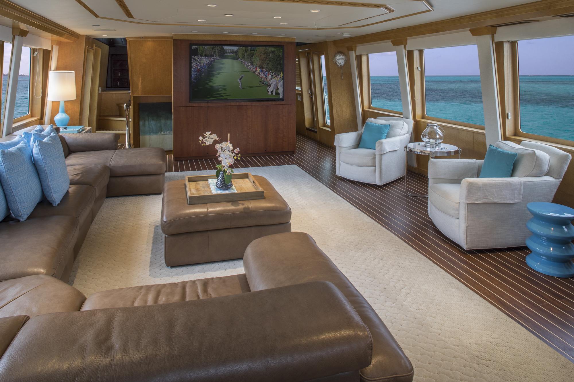 On the flybridge, the aft section is laid out with sunpads and armchairs while the central and forward deck area features an elongated ...