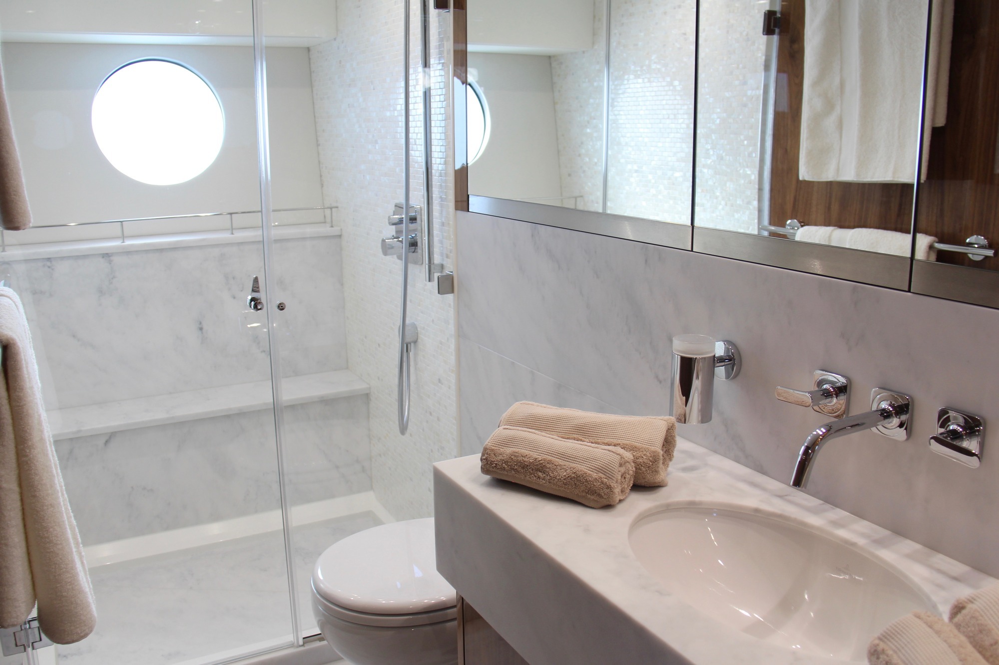 The VIP guest cabin is located forward and features an island double bed, a large wardrobe, a vanity as well as an ensuite bathroom. The double guest cabin is located starboard and has an island bed, hanging locker and bedside storage and has an access to an ensuite bathroom used also as a day head.