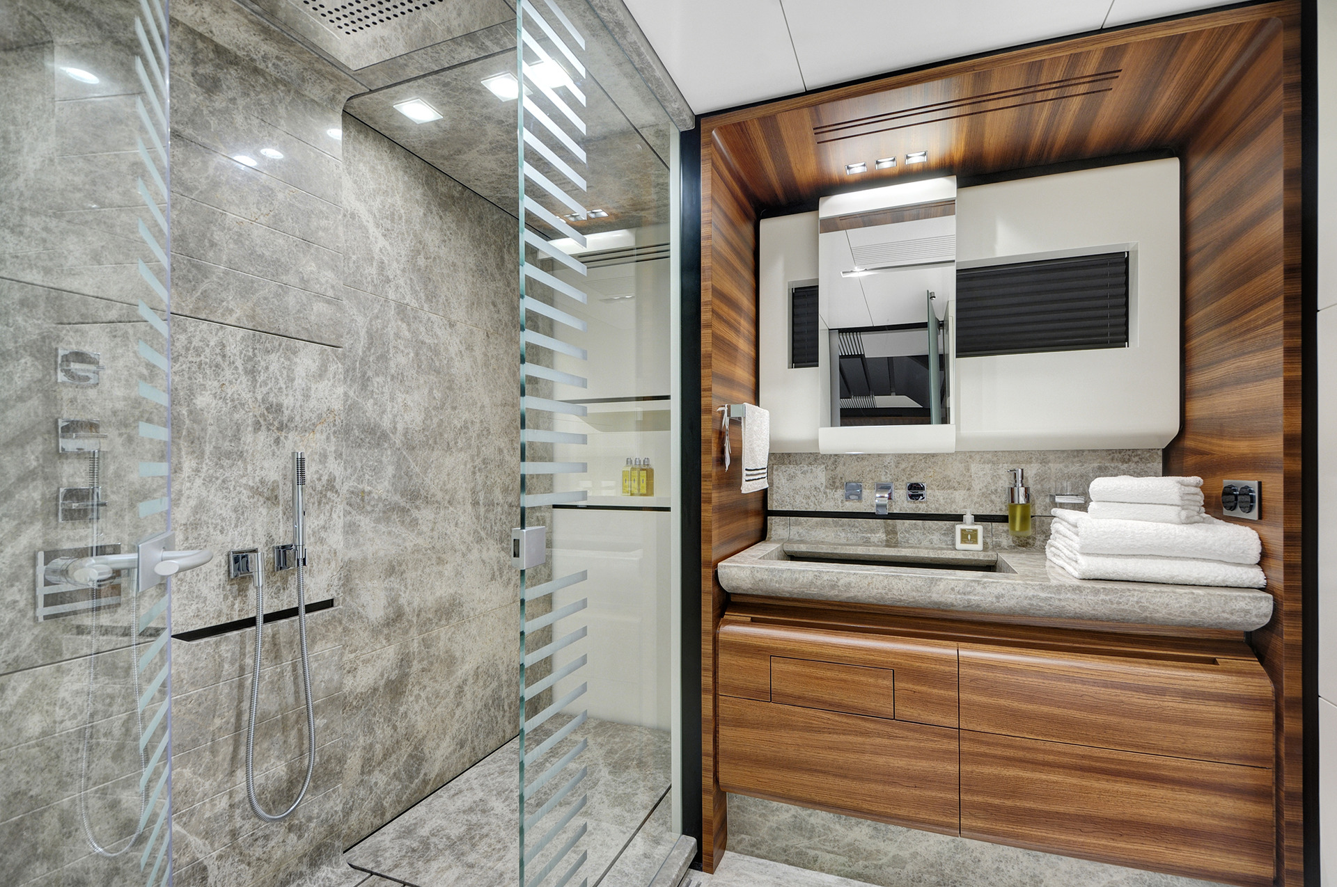 The lower deck stern contains a spacious beach club gym and the transom door folds down to create a large swim platform.