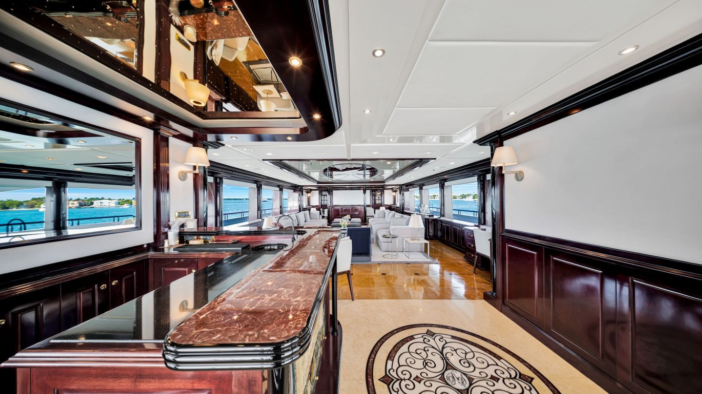 The salon and dining is an open plan, featuring a well-appointed lounge, offering ample seating and coffee tables and wet bar aft and full beam formal dining forward. Forward of the salon is the state of the art galley to port, with the foyer to starboard.