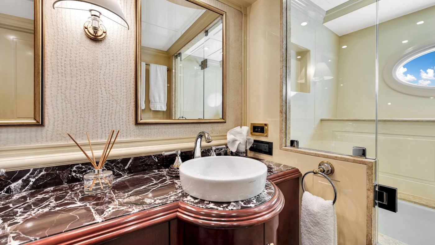 The upper deck features the master suite aft, with private access to the upper aft deck. The master suite offers a king size bed, sofa, lounge, walk-in wardrobe and massive en-suite, with deluxe Spa Pool tub. Forward of the master suite on the port side is a guest double, followed by the pilot house.