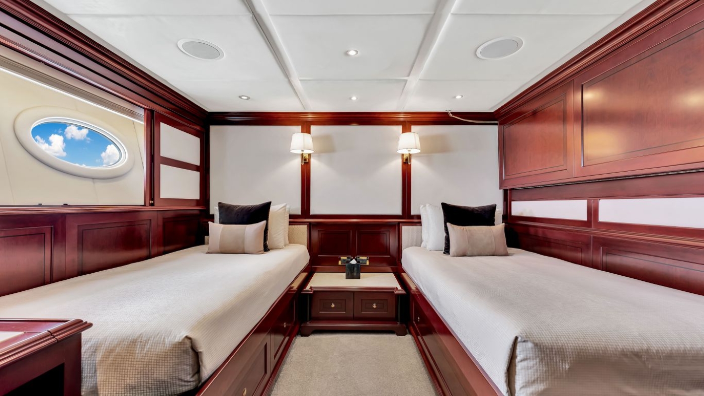 The master suite offers a king size bed, sofa, lounge, walk-in wardrobe and massive en-suite, with deluxe Spa Pool tub. Forward of the master suite on the port side is a guest double, followed by the pilot house. Below decks, guest accommodation consists of two double cabins and 2 twin cabins. All the cabins are generous and light.