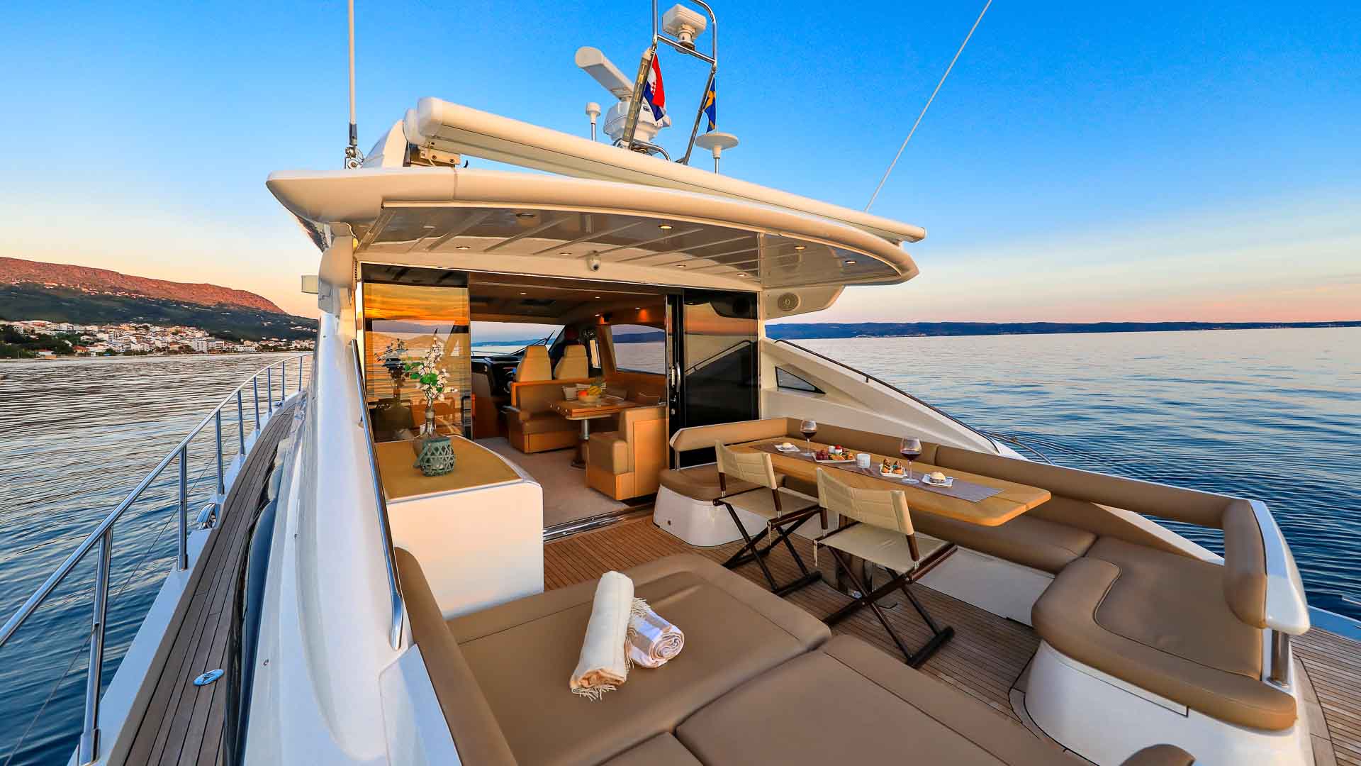 M/Y SPICE OF LIFE II has spacious outdoor living, comprising a large partially shaded aft deck which boasts dining, seating and sunning options. Side decks lead to a cozy sun pad arrangement, and optional fold-away Bimini.
