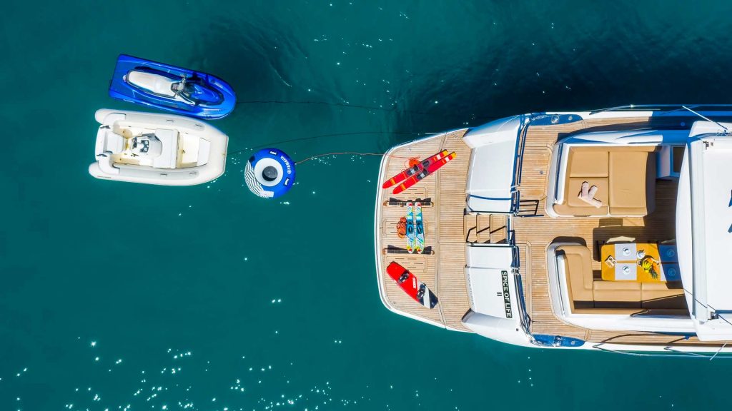 M/Y SPICE OF LIFE II has spacious outdoor living, comprising a large partially shaded aft deck which boasts dining, seating and sunning options. Side decks lead to a cozy sun pad arrangement, and optional fold-away Bimini.