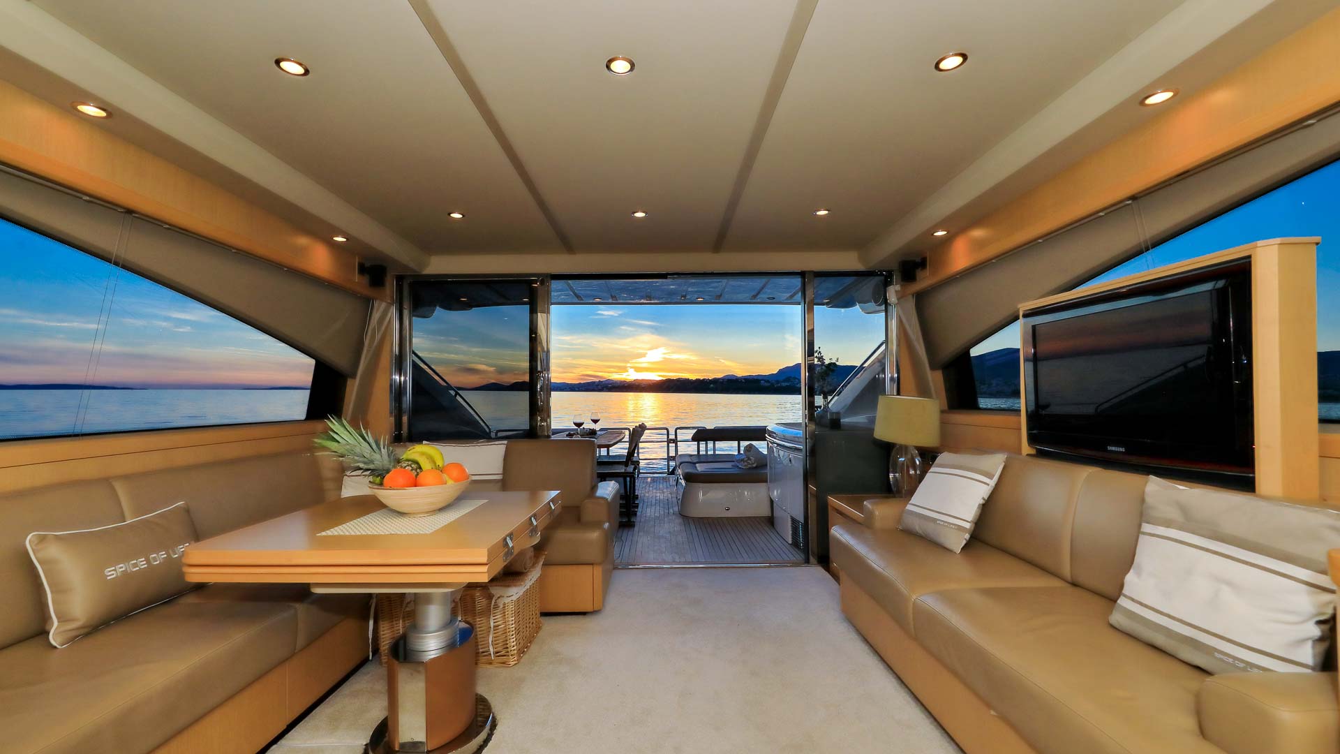 Entertainment systems conveniently hide away on the port side in a rise and fall compartment. With an overhead retractable roof, and surrounding elongated windows, the yacht delivers excellent natural light and endless views.