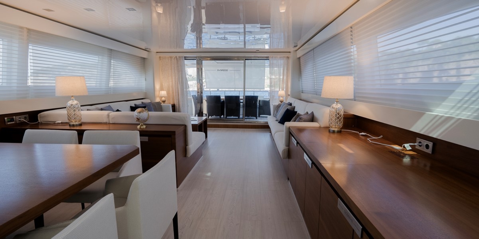 The main salon is arranged with built-in sofas – a corner soft and opposing three-seater – in the aft zone, creating a cosy lounge. Forward is a square eight-seater dining table and chairs creating a very sociable space for formal dining.