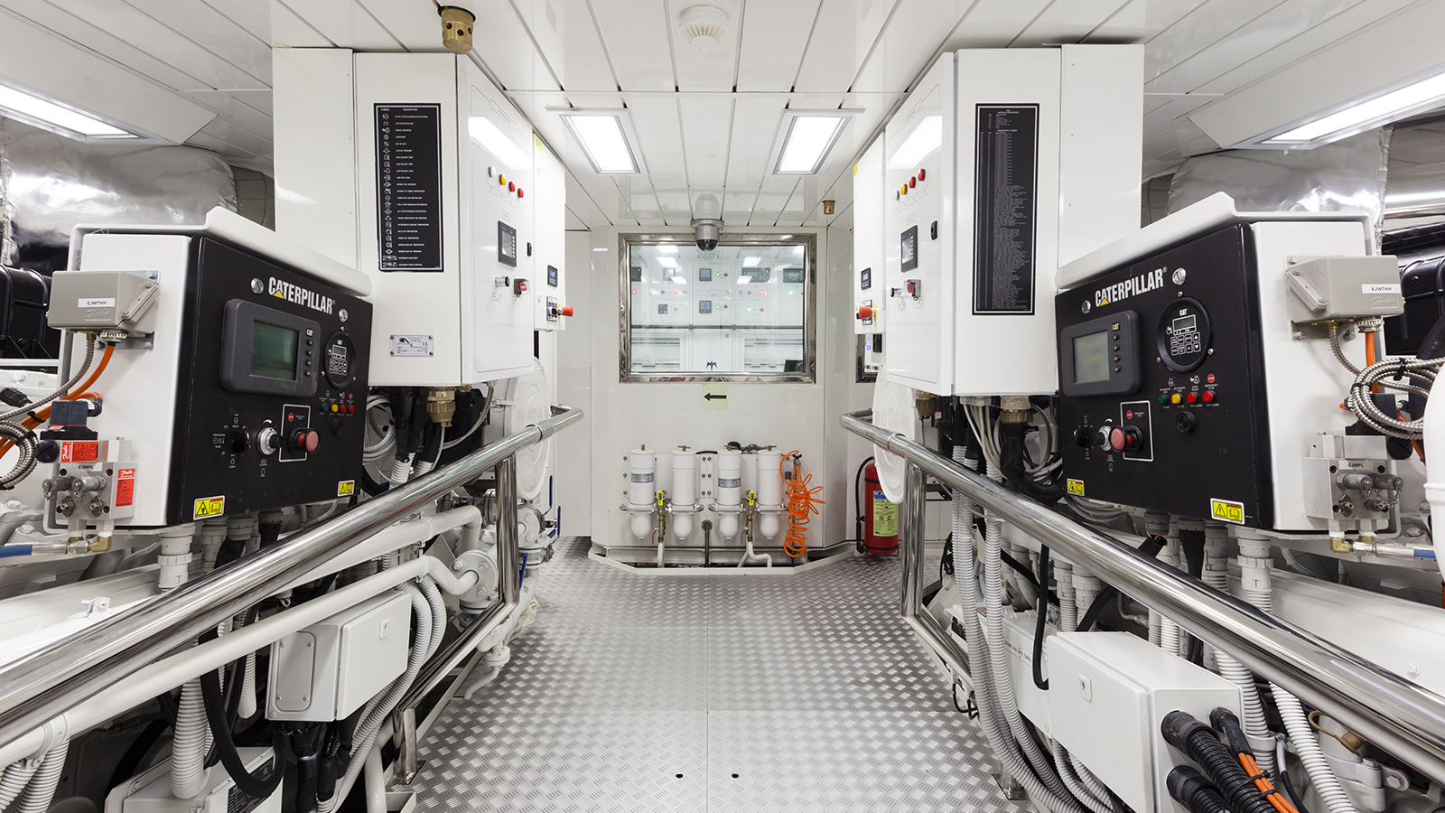 Forward of the engine room is the guest accommodation, consisting of two double cabins and two tine cabins, all of which have en-suite facilities. Crew accommodation is located in the bow.