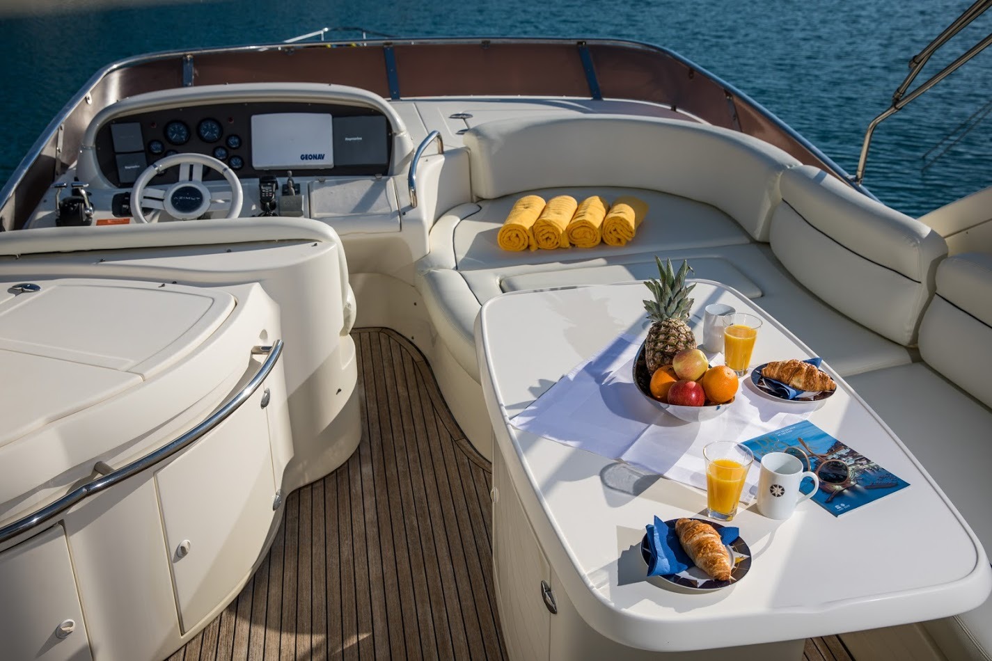 The saloon is a perfect area to unwind while the dining area offers seating for all guests and can be set up for lovely formal dinners or casual meals. Further possibility for dining/breakfast is offered on the flybridge which is also fantastic for panoramic views.
