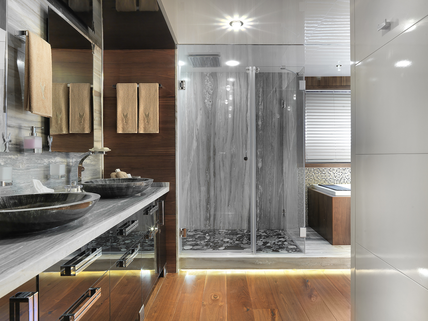 The main saloon features a large c-shaped sofa in white colour, complimenting the lacquered wooden furniture and joinery.