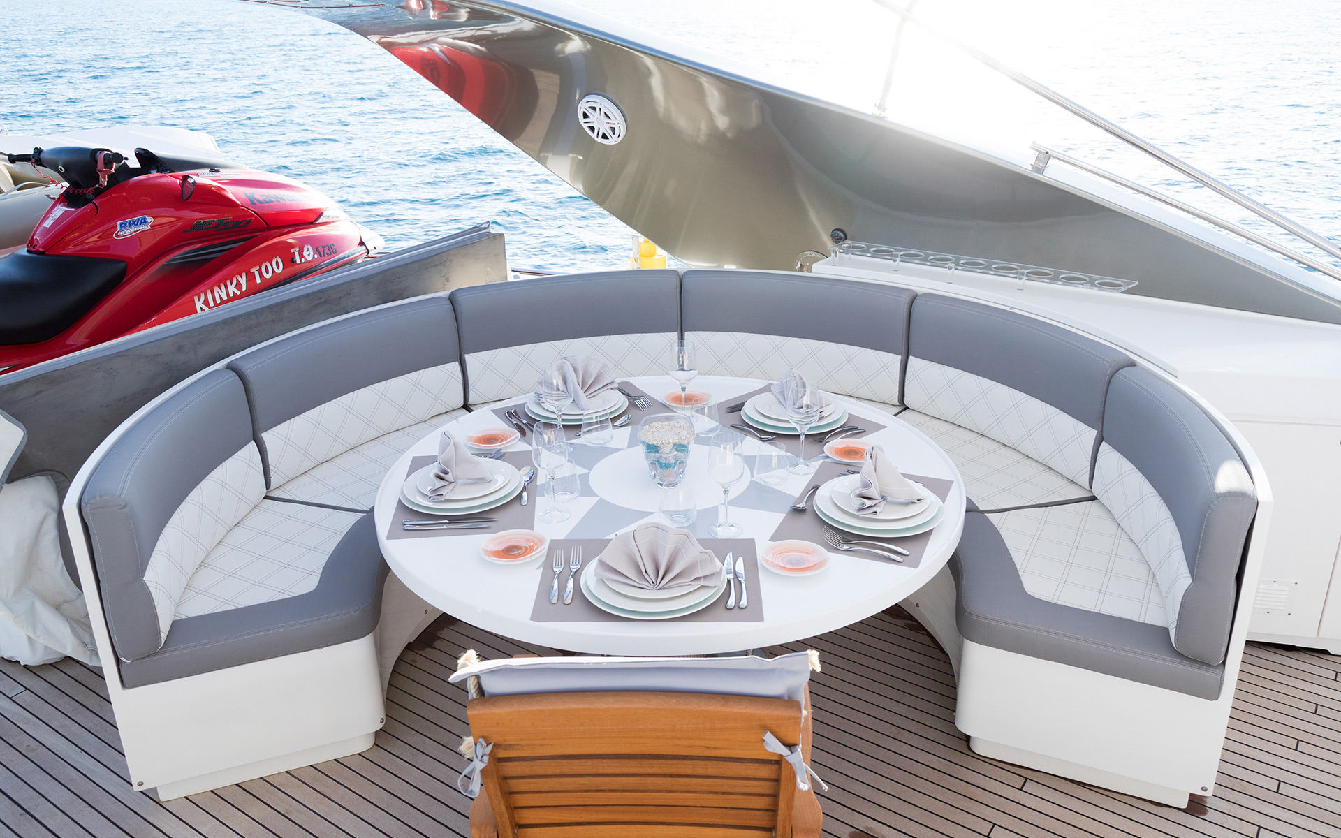 Her dining area can seat up to eight guests around the elegant round table. Exterior deck areas offer an additional dining possibility as well as fabulous on deck Jacuzzi spa with a TV.