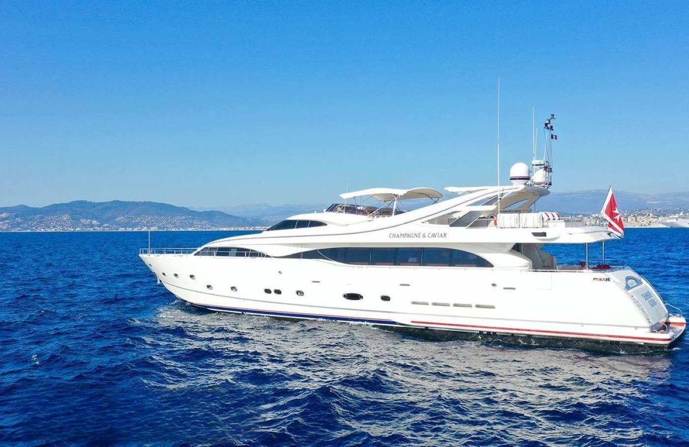 Luxury yacht CHAMPAGNE AND CAVIAR (Champagne Seas, Tacos of the Seas, Intimis, Rubbecan, Ruby) measures 34.14m (112') and was launched by the Italian shipyard Ferretti in 2004. Refitted in 2024, the yacht has modern classic, elegant interiors accommodating up to 12 charter guests over a five-cabin layout.