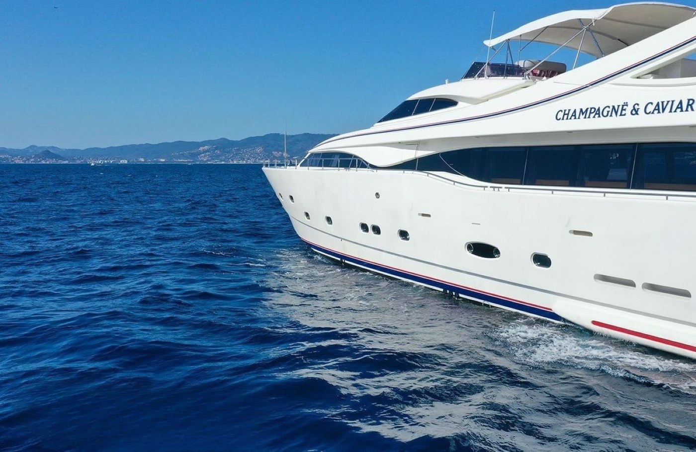 Luxury yacht CHAMPAGNE AND CAVIAR (Champagne Seas, Tacos of the Seas, Intimis, Rubbecan, Ruby) measures 34.14m (112') and was launched by the Italian shipyard Ferretti in 2004. Refitted in 2024, the yacht has modern classic, elegant interiors accommodating up to 12 charter guests over a five-cabin layout.