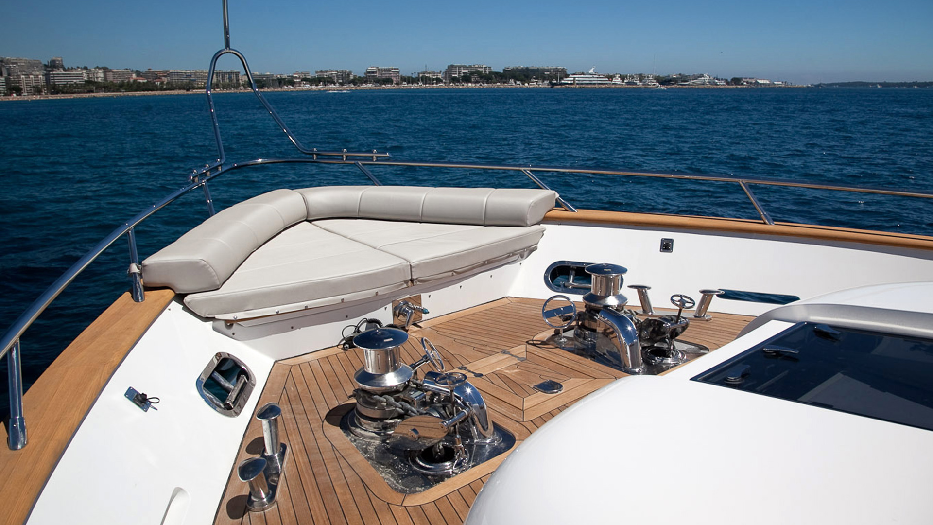 The bow is fitted with sunpads that can be shaded by a canvas for all-day outdoor relaxation.
