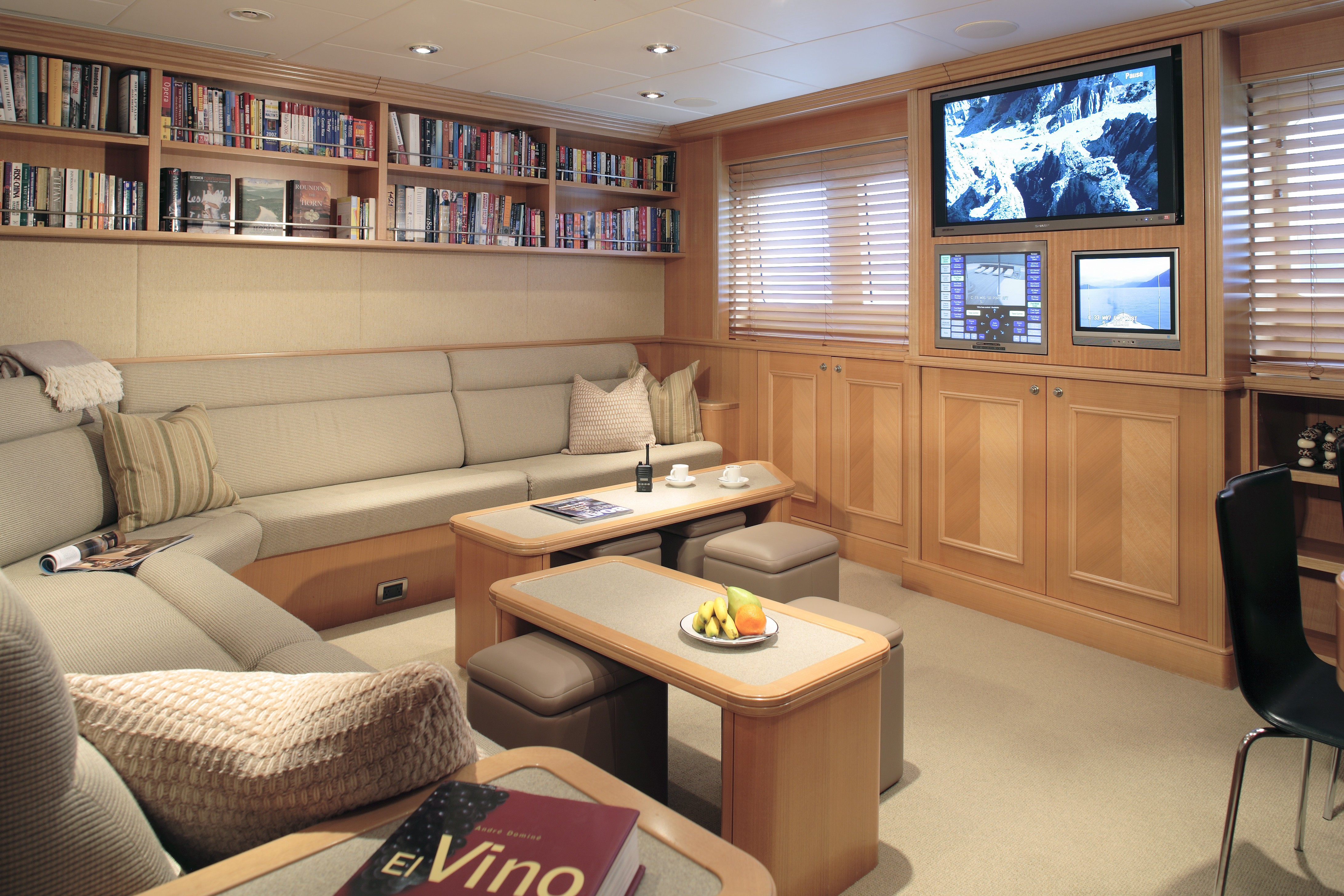 On the main deck, the forward section hosts the full-beam Master suite, which also has a study, day pantry, walk-in wardrobes and two private side-terraces. The main salon and formal dining area are furnished in anigré for a ...