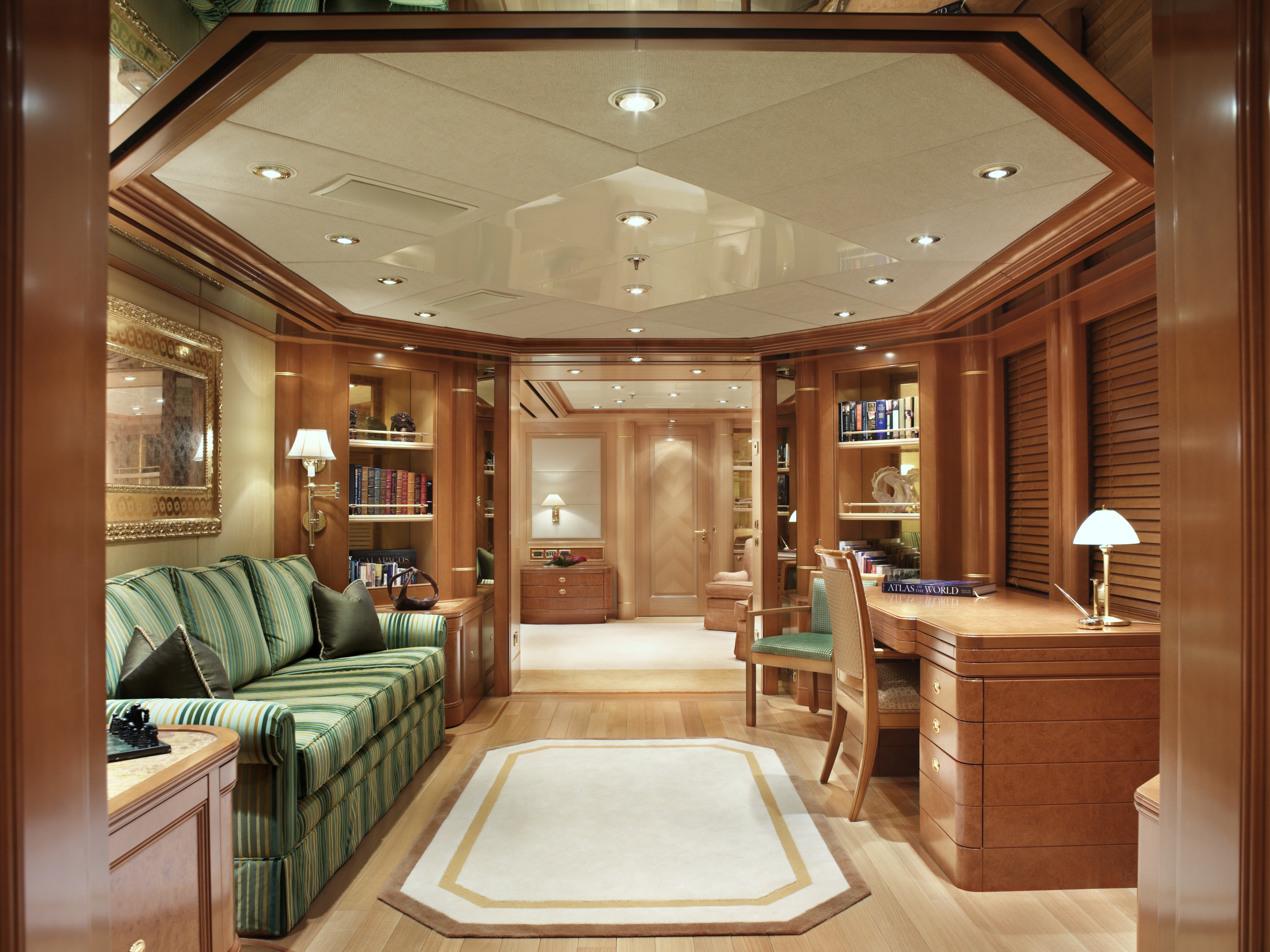 On the main deck, the forward section hosts the full-beam Master suite, which also has a study, day pantry, walk-in wardrobes and two private side-terraces. The main salon and formal dining area are furnished in anigré for a ...