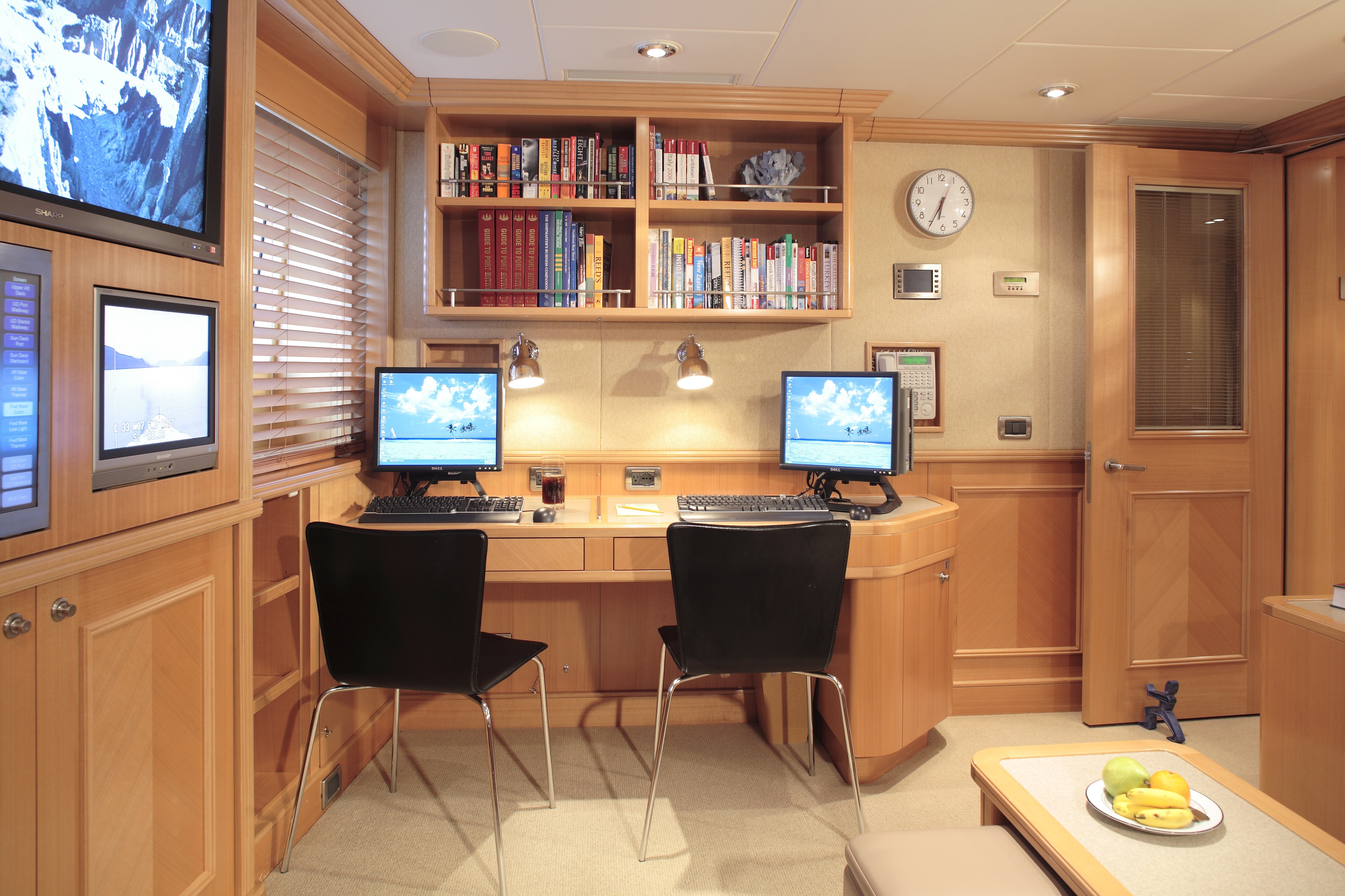 On the main deck, the forward section hosts the full-beam Master suite, which also has a study, day pantry, walk-in wardrobes and two private side-terraces. The main salon and formal dining area are furnished in anigré for a ...