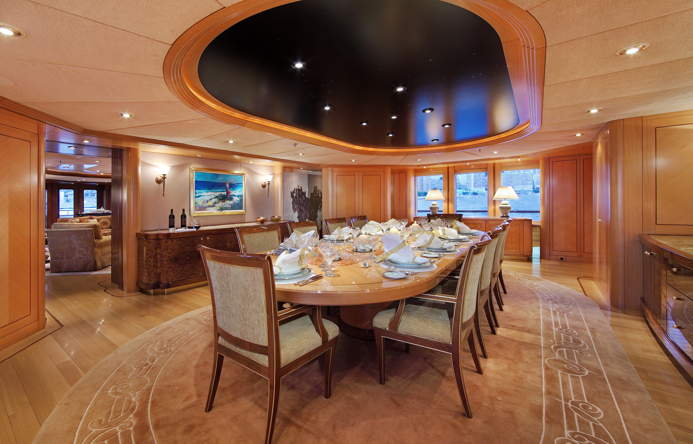 The main salon and formal dining area are furnished in anigré for a stately, timeless appearance with all the benefits of modern technology and comfort.