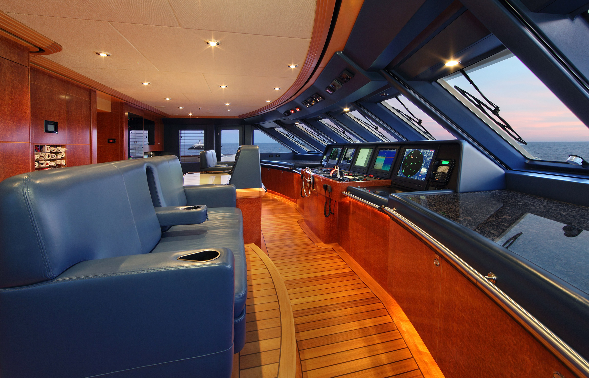 The upper deck forward contains the helm station, behind which is a media room that can also be used as a library or private study area.