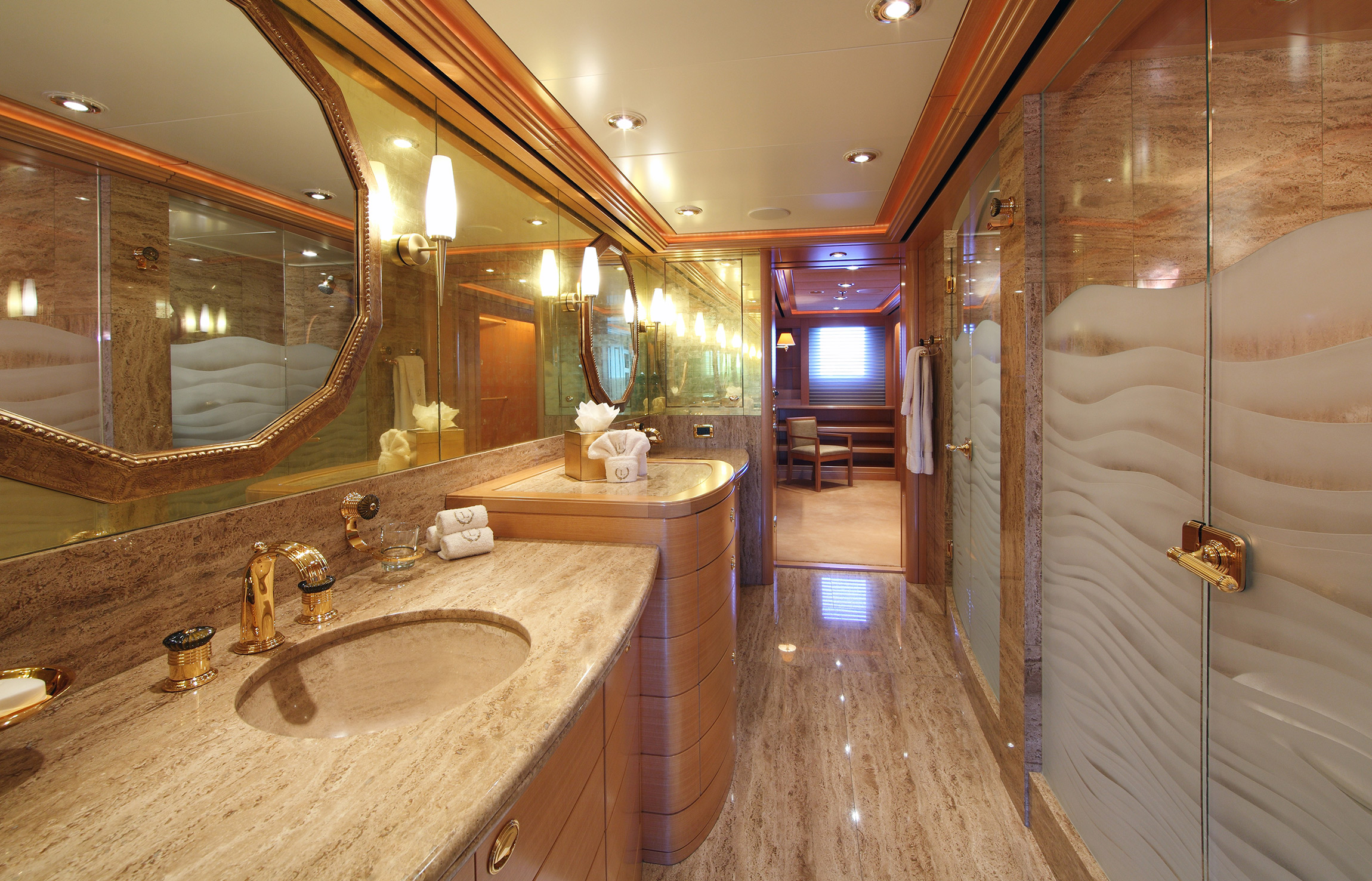 The upper deck forward contains the helm station, behind which is a media room that can also be used as a library or private study area.