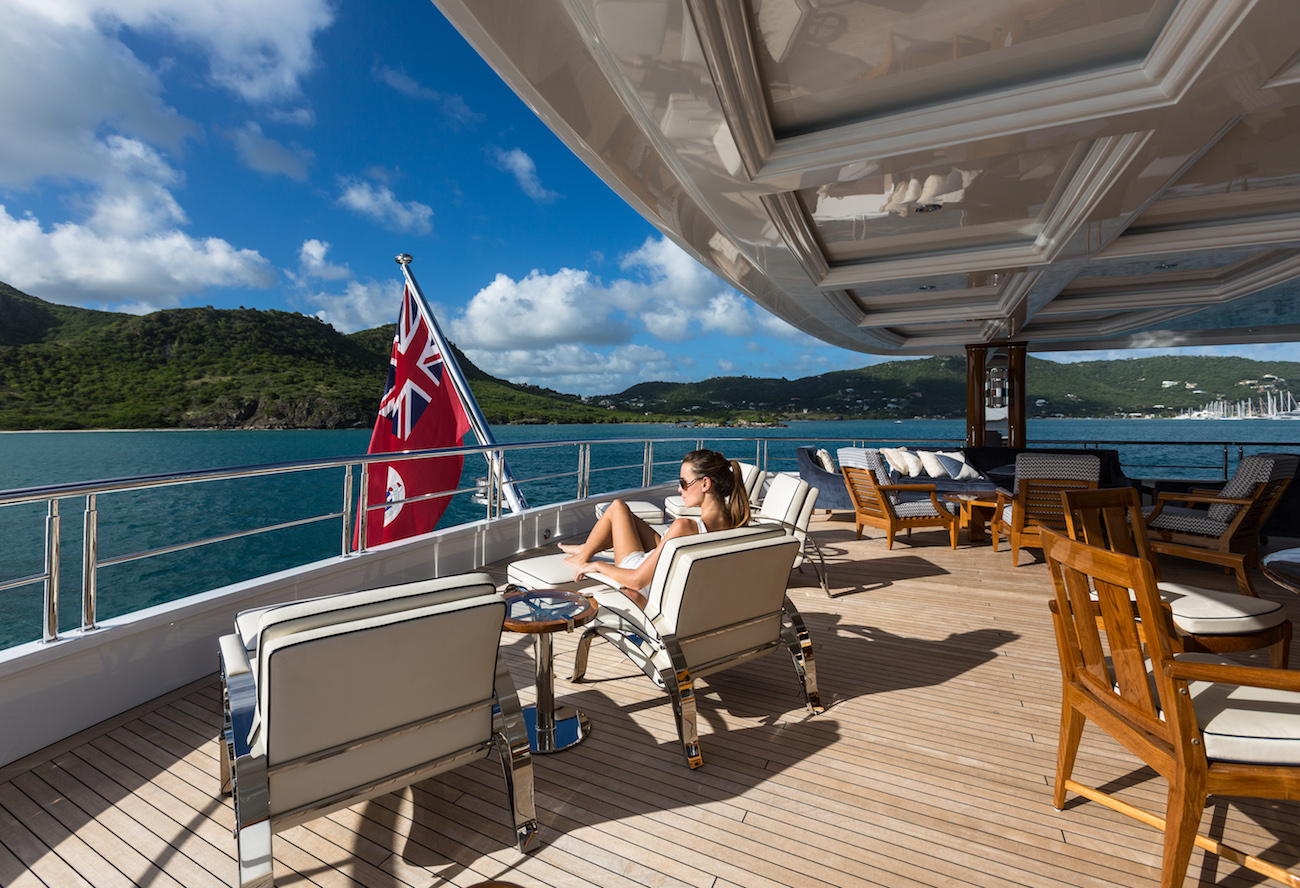 The starboard side provides guests with their own armchair and cocktail table for taking in the views, while in the centre there is an impressive formal dining table to serve 12 and a wet bar.