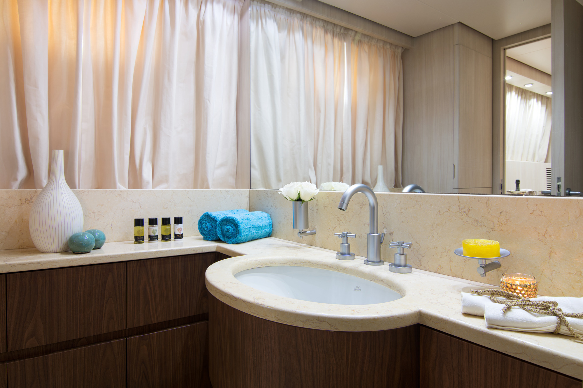 The beautiful interiors from Piero Lissoni blends neutral décor – wood flooring, soft fabrics and light oak furnishings – and is filled with natural light. The main salon is a lovely family friendly space configured with a comfortable lounge aft and a formal dining area forward.