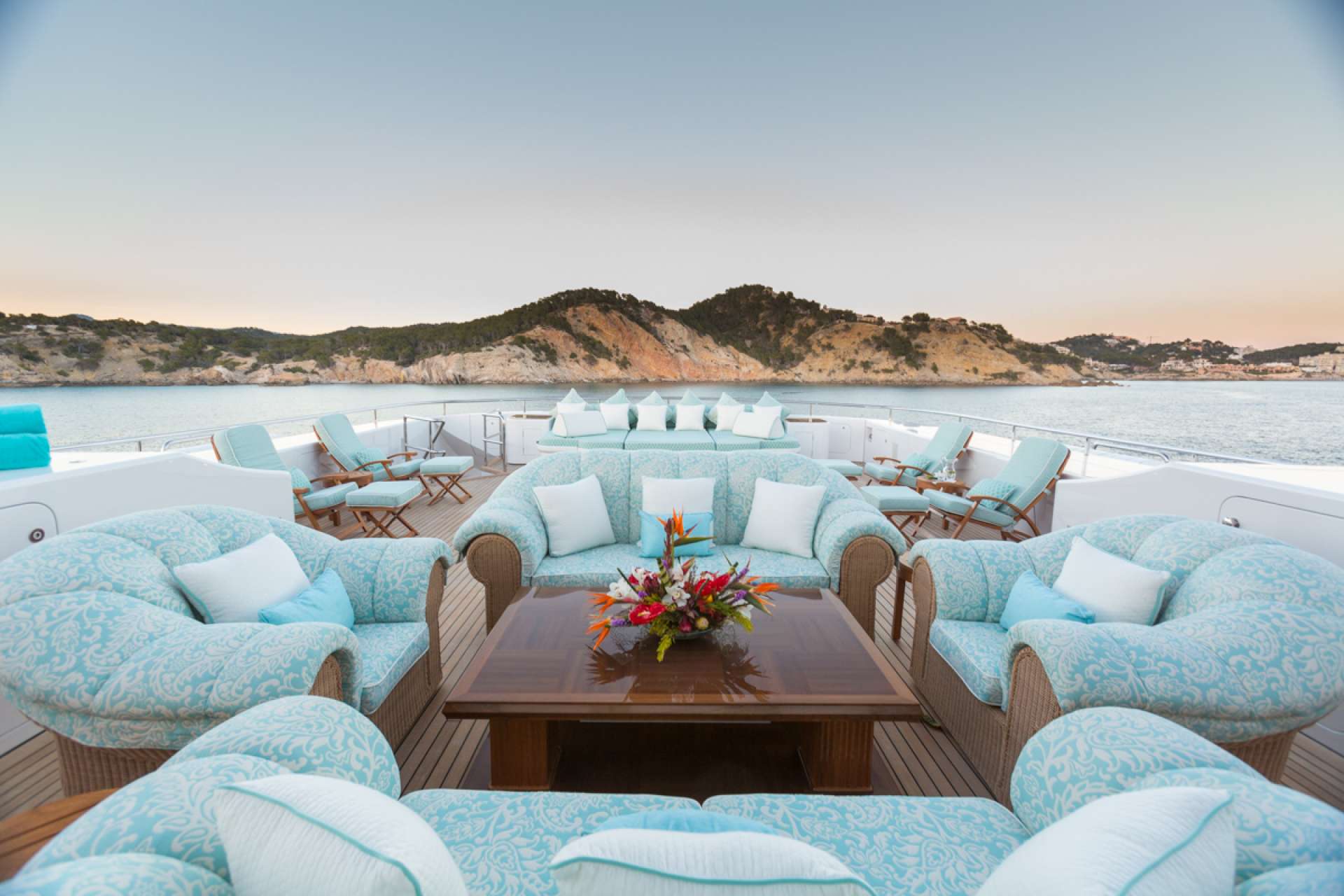 Sun loungers are placed on both sides and farther forward there is an opulent seating area comprised of over-stuffed sofas and armchairs. Under the shade of the hardtop, there is a casual dining area and a bar.