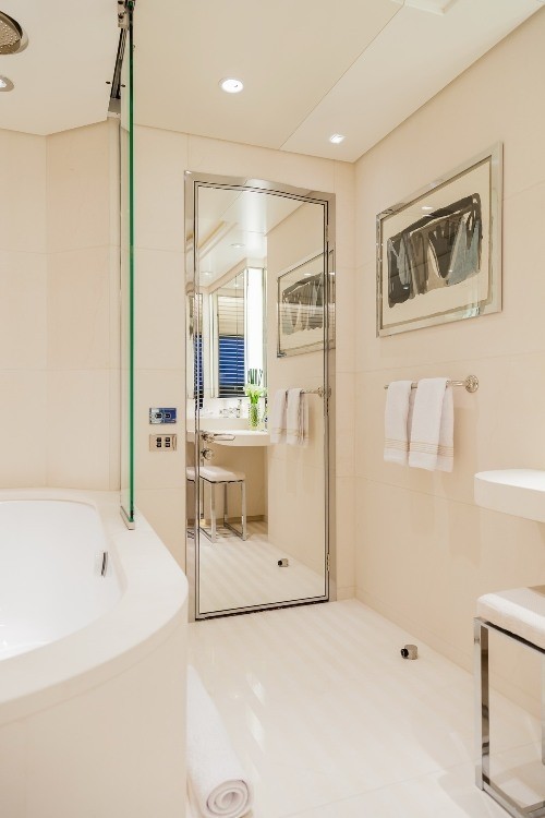 The full-beam Master suite has two separate 'his' and 'hers' bathrooms and a large walk-in wardrobe in between. The seating is placed by the port and starboards windows and there is a forward office to complete the private ...