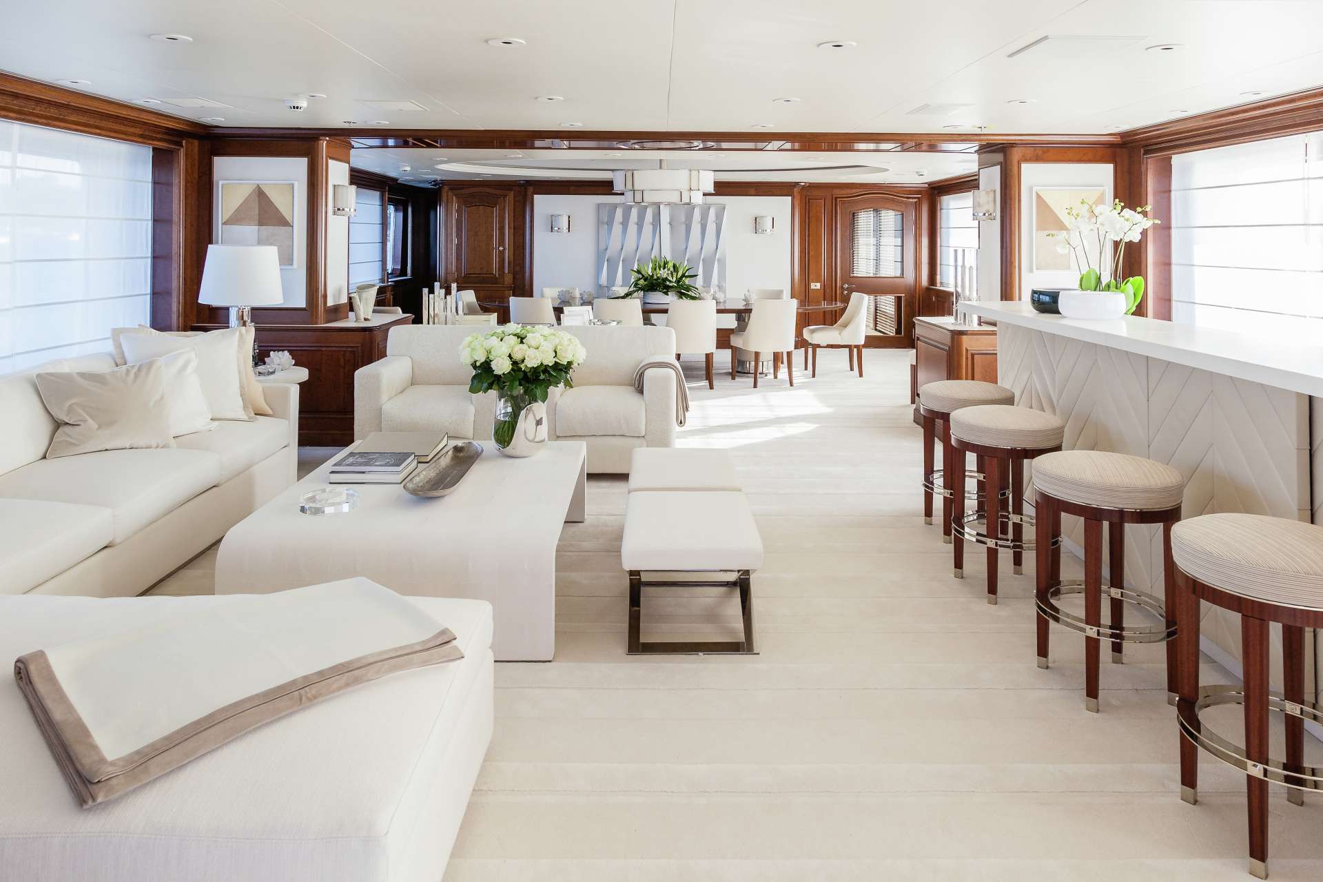 The upper deck has a blue-toned sky lounge with an L-shaped sofa, armchairs and a coffee table as well as a bar close to the aft sliding doors.
