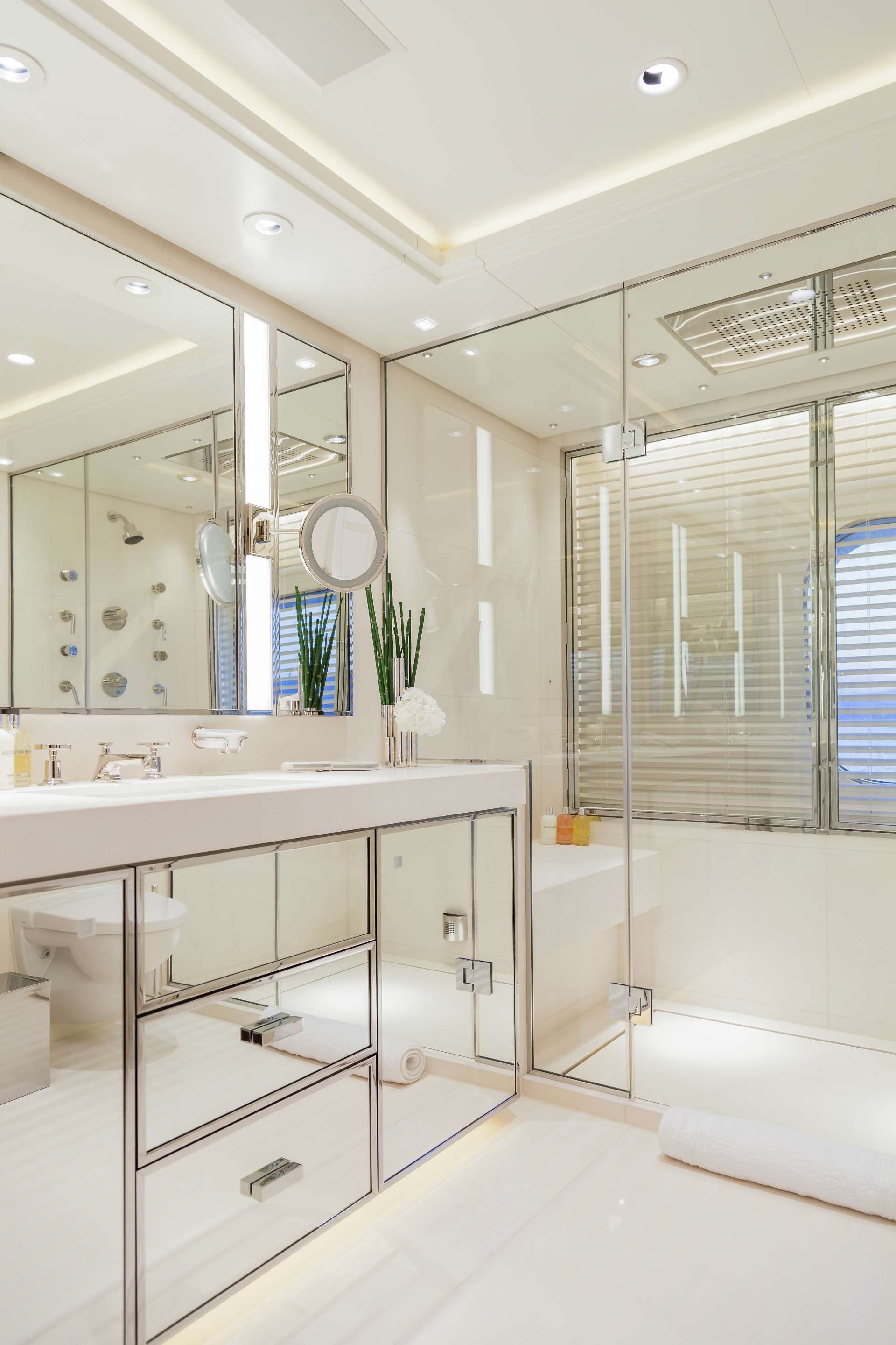 The main deck layout stores the tenders forward of the Master suite and they are launched and retrieved by side hatches. The full-beam Master suite has two separate 'his' and 'hers' bathrooms and a large walk-in wardrobe in between.