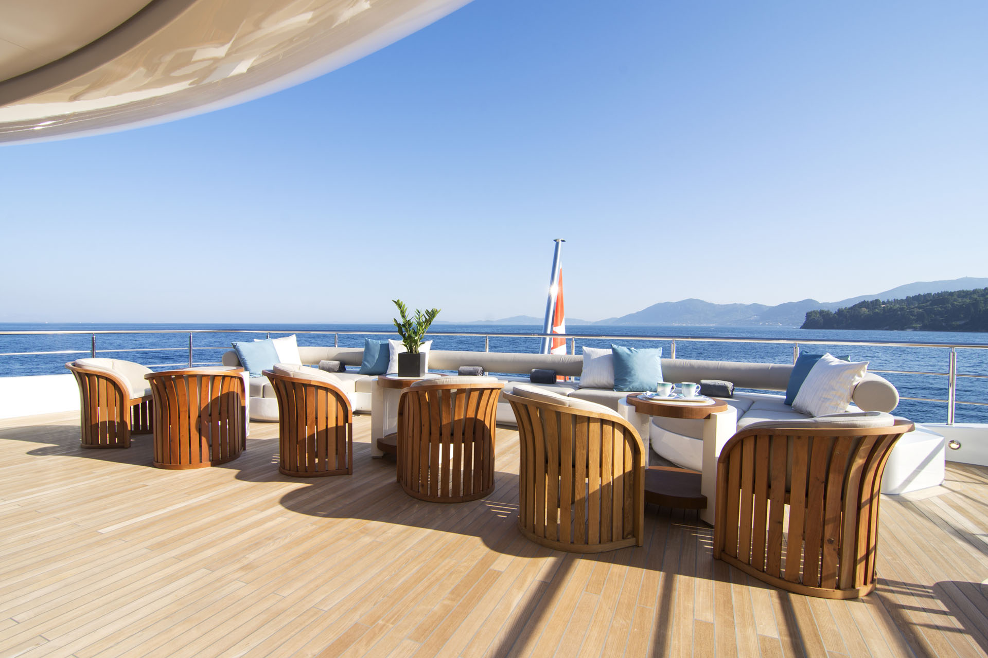 Here, a large sofa along the stern makes a comfortable waiting area or place to dine alfresco in the shade of the upper deck overhang.