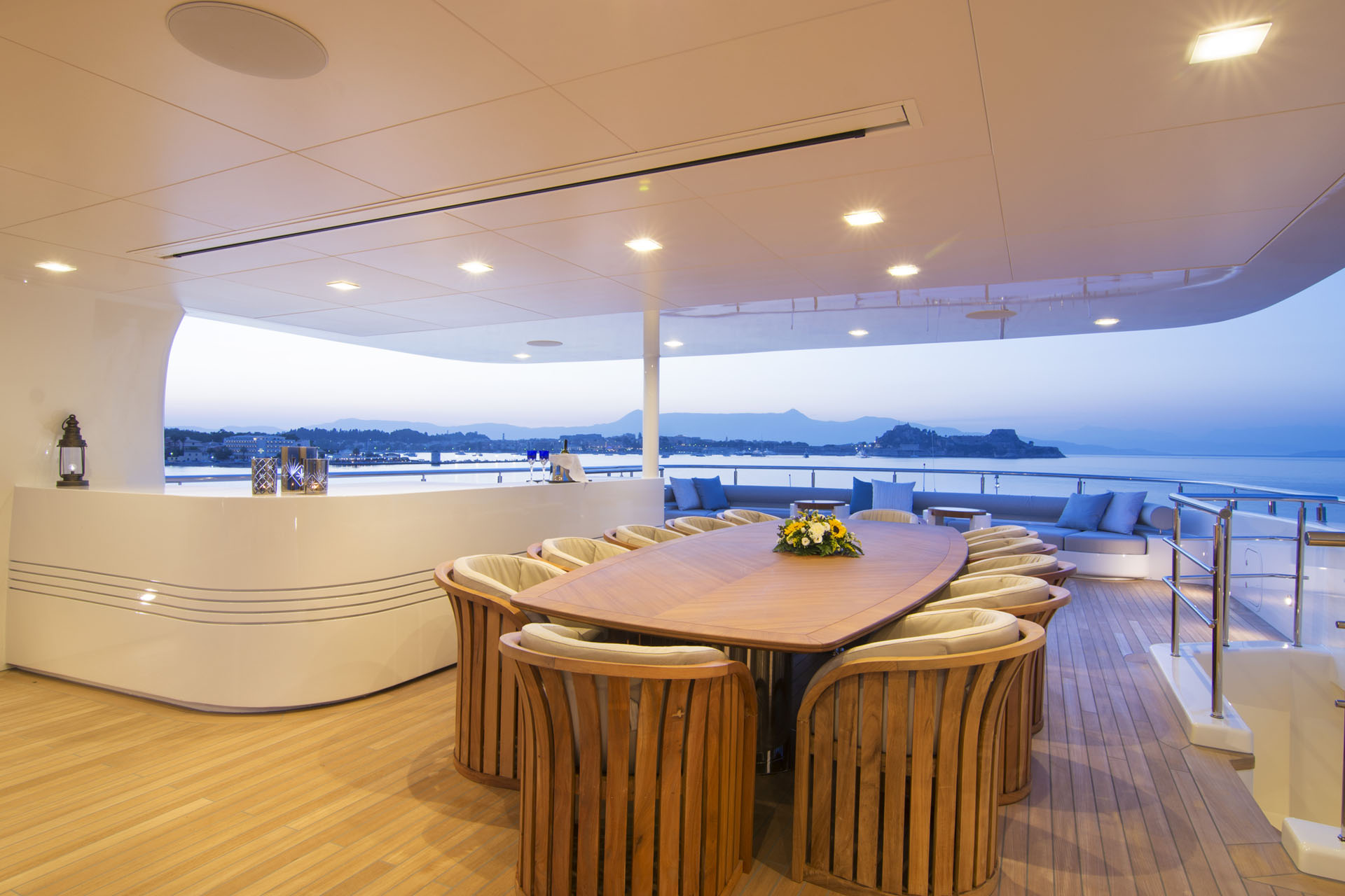 Here, a large sofa along the stern makes a comfortable waiting area or place to dine alfresco in the shade of the upper deck overhang.