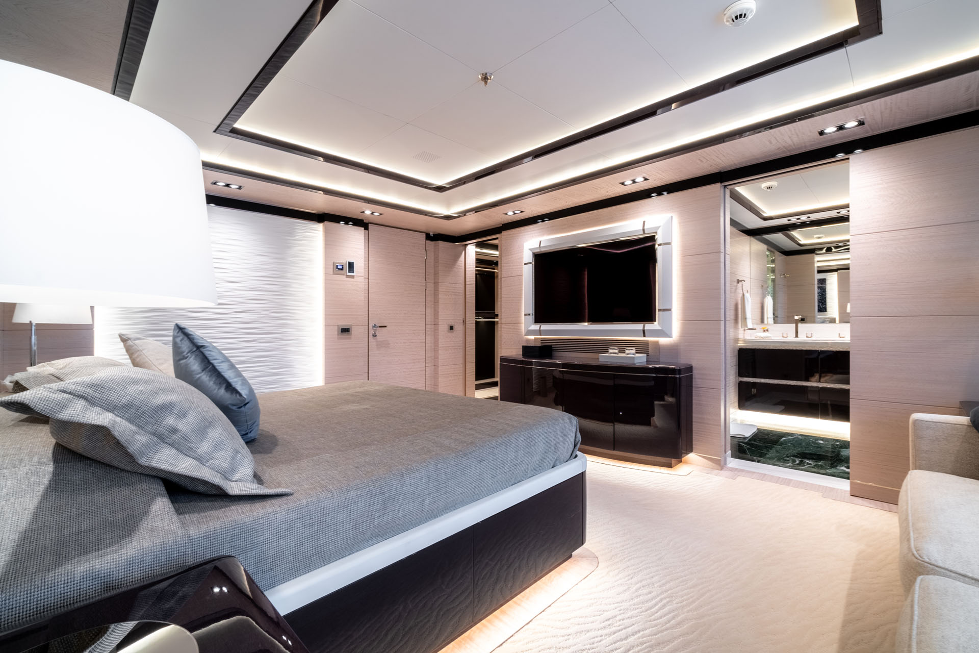 On the main deck, the foredeck hosts the full-beam VIP stateroom boasting a lounge and large en-suite bathroom. There are also four double cabins, two of which are convertible to twins and a further twin cabin.