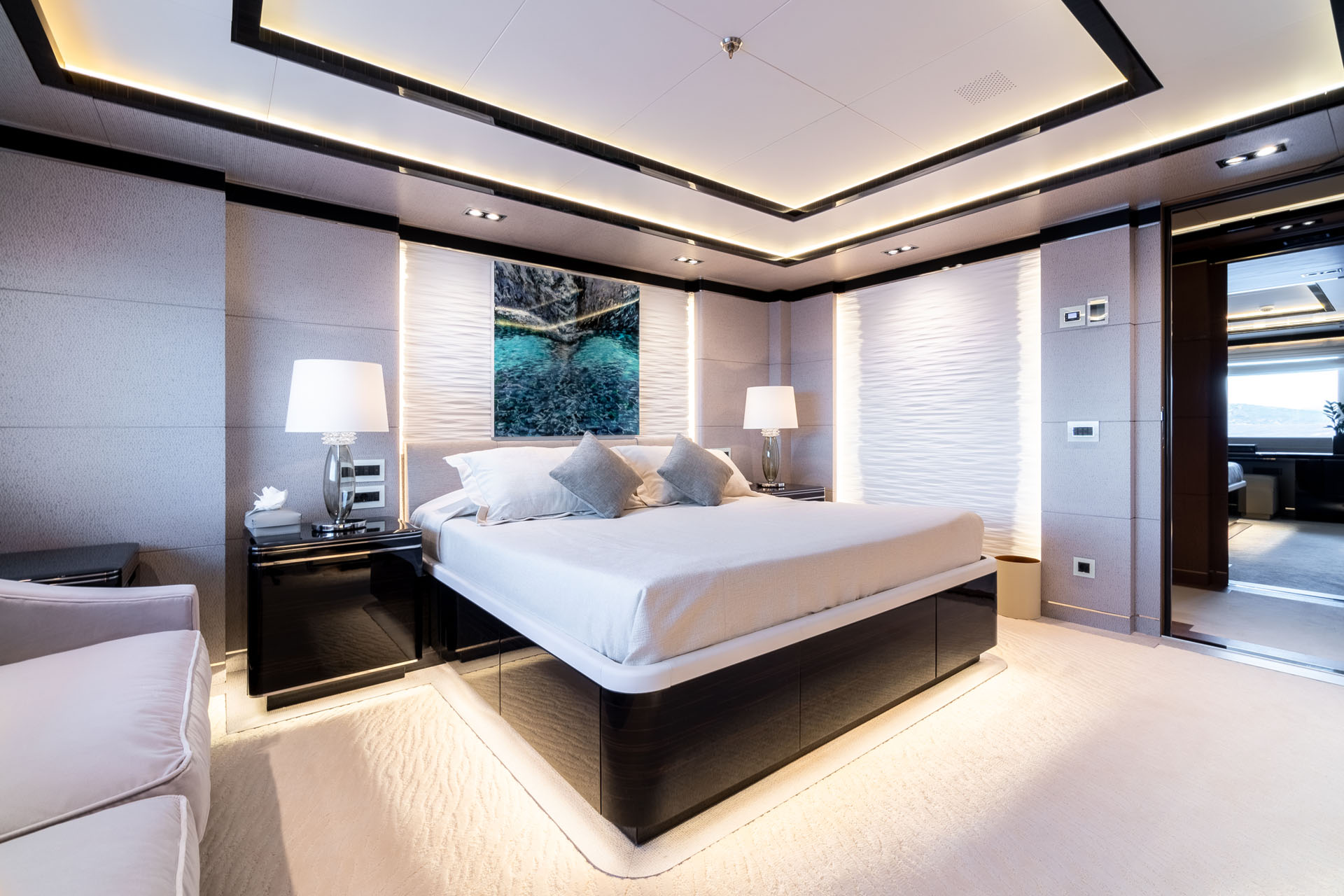 On the main deck, the foredeck hosts the full-beam VIP stateroom boasting a lounge and large en-suite bathroom. There are also four double cabins, two of which are convertible to twins and a further twin cabin.