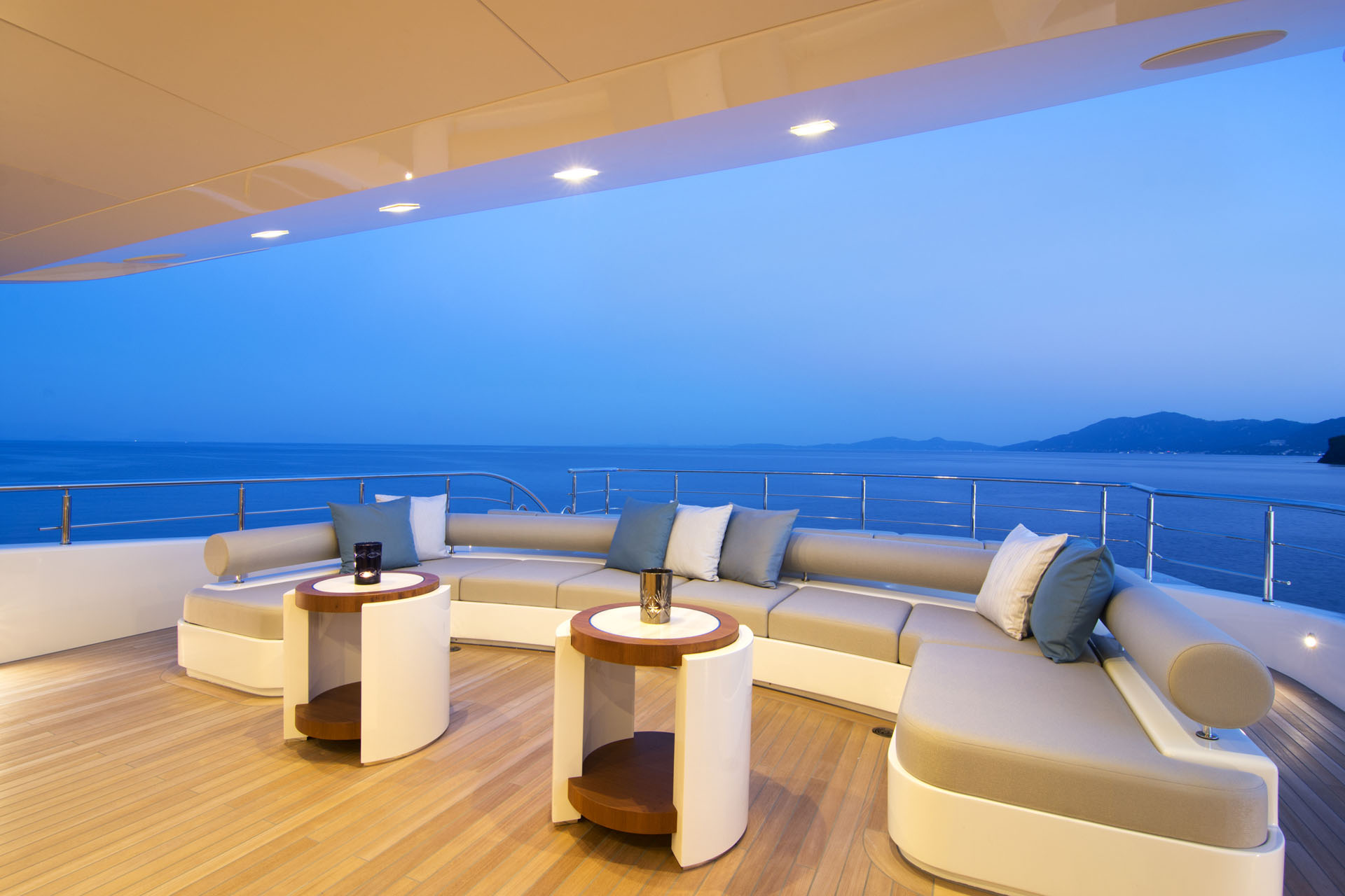Above, the bridge deck aft is the focal point for daytime relaxation in the sunshine, offering a ...