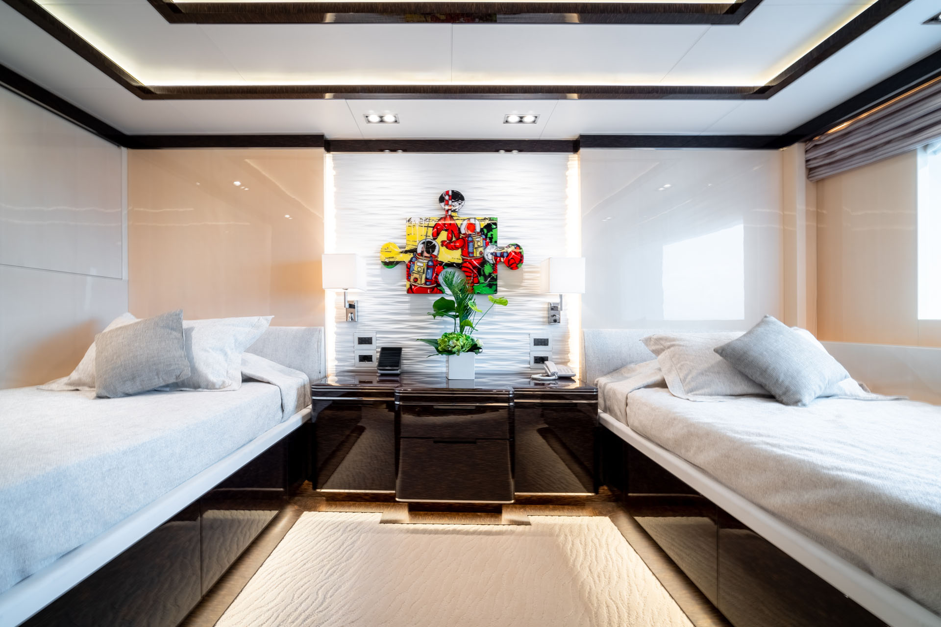 On the main deck, the foredeck hosts the full-beam VIP stateroom boasting a lounge and large en-suite bathroom. There are also four double cabins, two of which are convertible to twins and a further twin cabin.